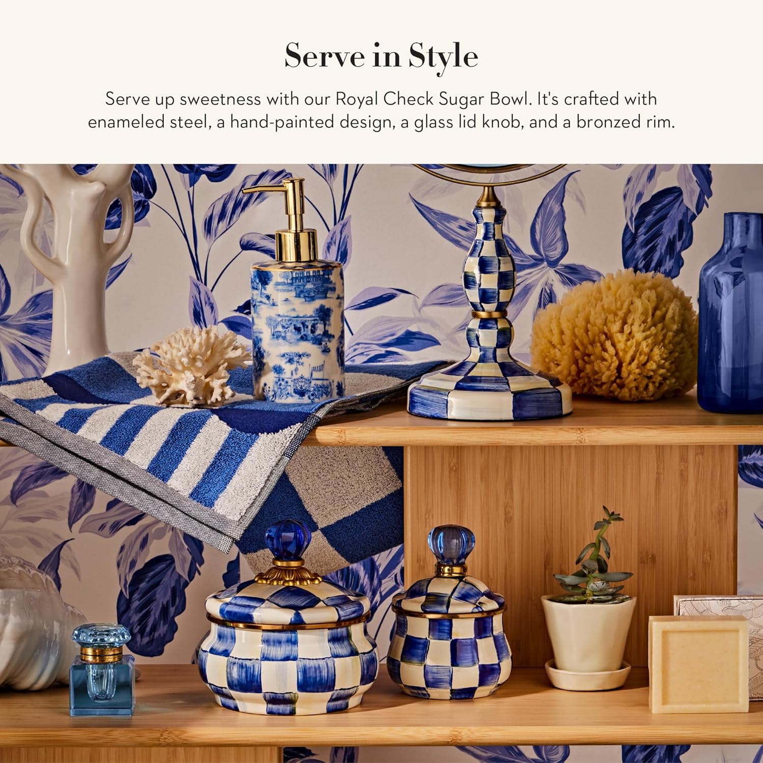 MACKENZIE-CHILDS Enamel Lidded Sugar Bowl, Small Serving Bowl with Lid, 10-Ounce Capacity, Blue-and-White Royal Check