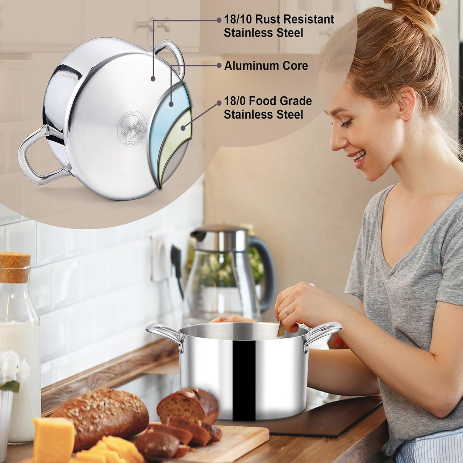- Premium& Healthy Material, 8 quart pot with lid is made of high quality food grade stainless steel, it can’t chemically react to any food at high temperatures, which is non-toxic, non-allergic & safe for cooking, large pasta pot with 3 layers structure including 2 layers stainless steel and 1 layer aluminum core(others just use 1 layer metal), our pot is anti-rust and warp resistant, lot more durable and sturdier