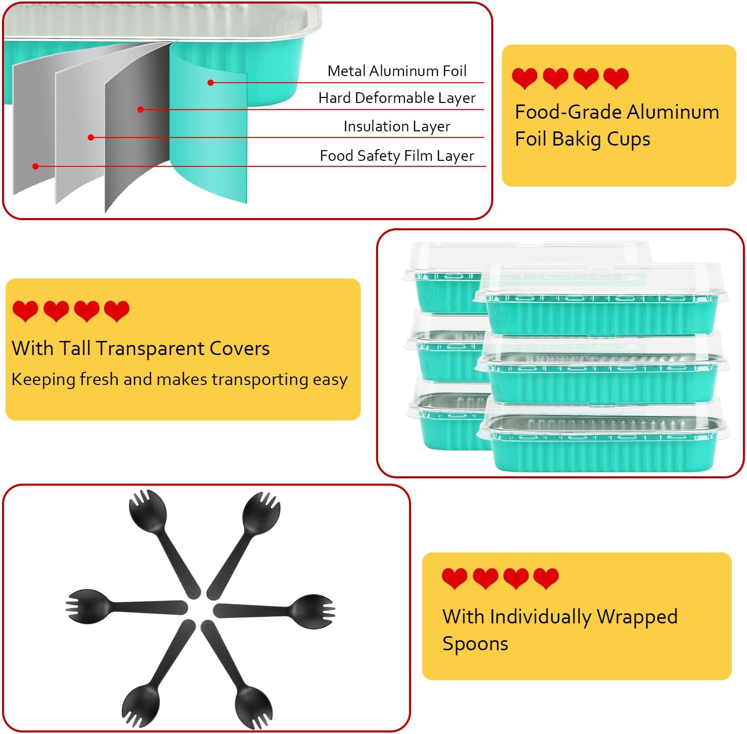 - 【Pack of 100 Sets】 - Including 100pcs mini cake pans with 100 clear lids,and 100 individually wrapped spoons.The mini loaf pan size:6.5”x2.5”x1.2”,the dome lids 0.8” high.Abundant small cake pans with lids are great for bake shops,big parties.