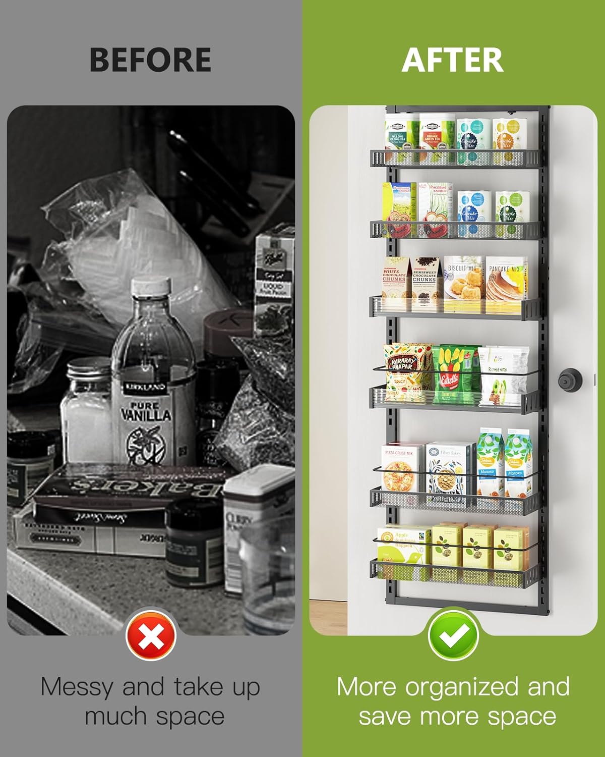 - HANG BEHIND THE DOOR OR DRILL TO WALL-MOUNT! Our door pantry organizer is designed for doors 22" or wider, and also comes with a wall-mount panel for you to choose from. It's also apartment and tenant friendly, so you're sure to get a solution you'll be happy with.