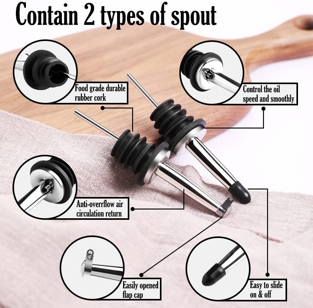 - Two Controlled Pouring Spouts 18, 8 Stainless steel pour spouts with sealed cap or flap cap, fit the bottle well and keep dust out. The pouring fluid is smooth without sticking and can easily dispense the right amount of oil for a healthy diet.