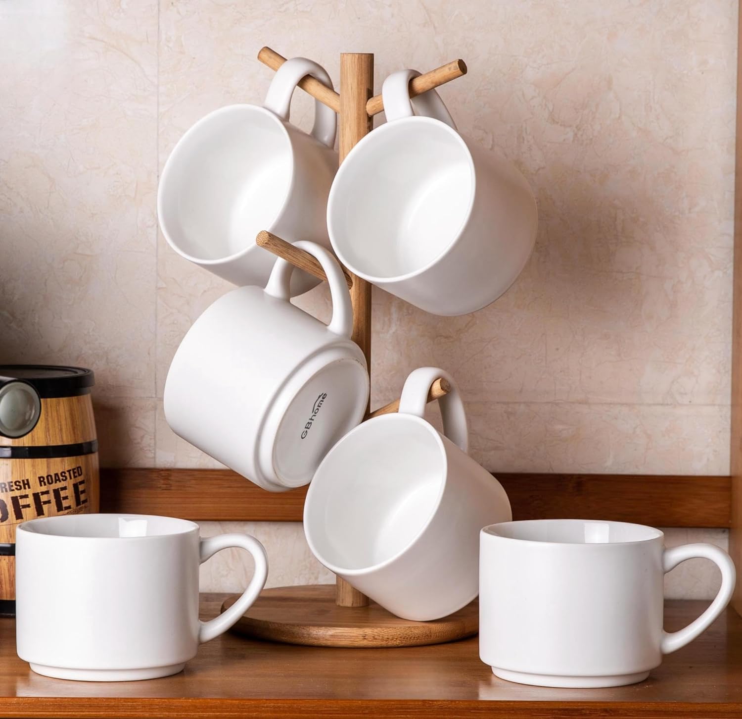 GBHOME 14 OZ Coffee Mugs Set of 6, Stackable Ceramic Mugs for Men, Women, Modern Coffee Mugs With Stable Base for Latte, Tea, Cappuccino. Dishwasher & Microwave Safe, Matte White