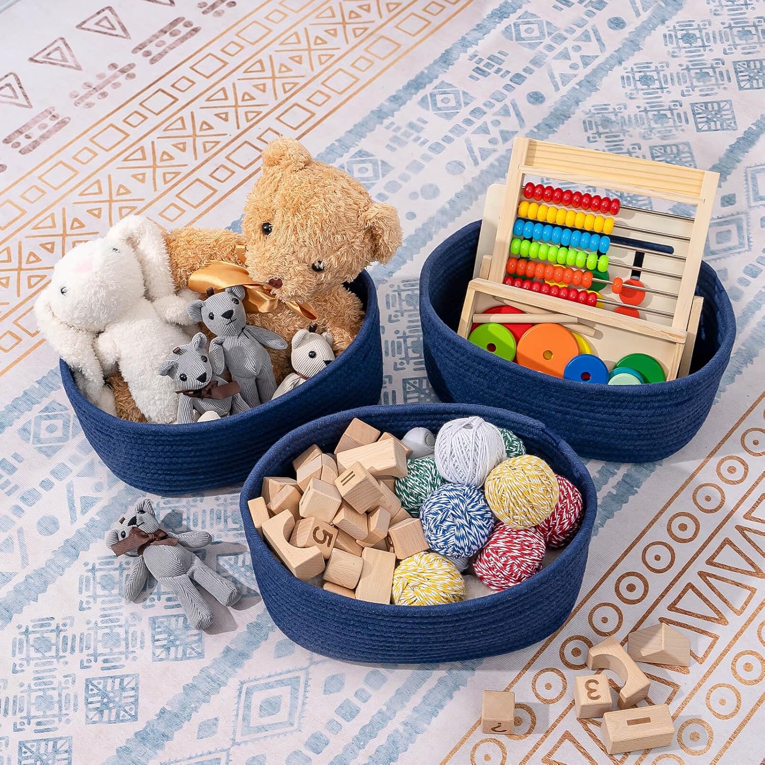 CubesLand Small Storage Baskets for Shelves, Navy Blue Closet Organization Storage Bins Empty Gift Basket 3 Packs Baby Nursery Woven Baskets for Organizing, Rectangular Clothes Closet Shelves Baskets