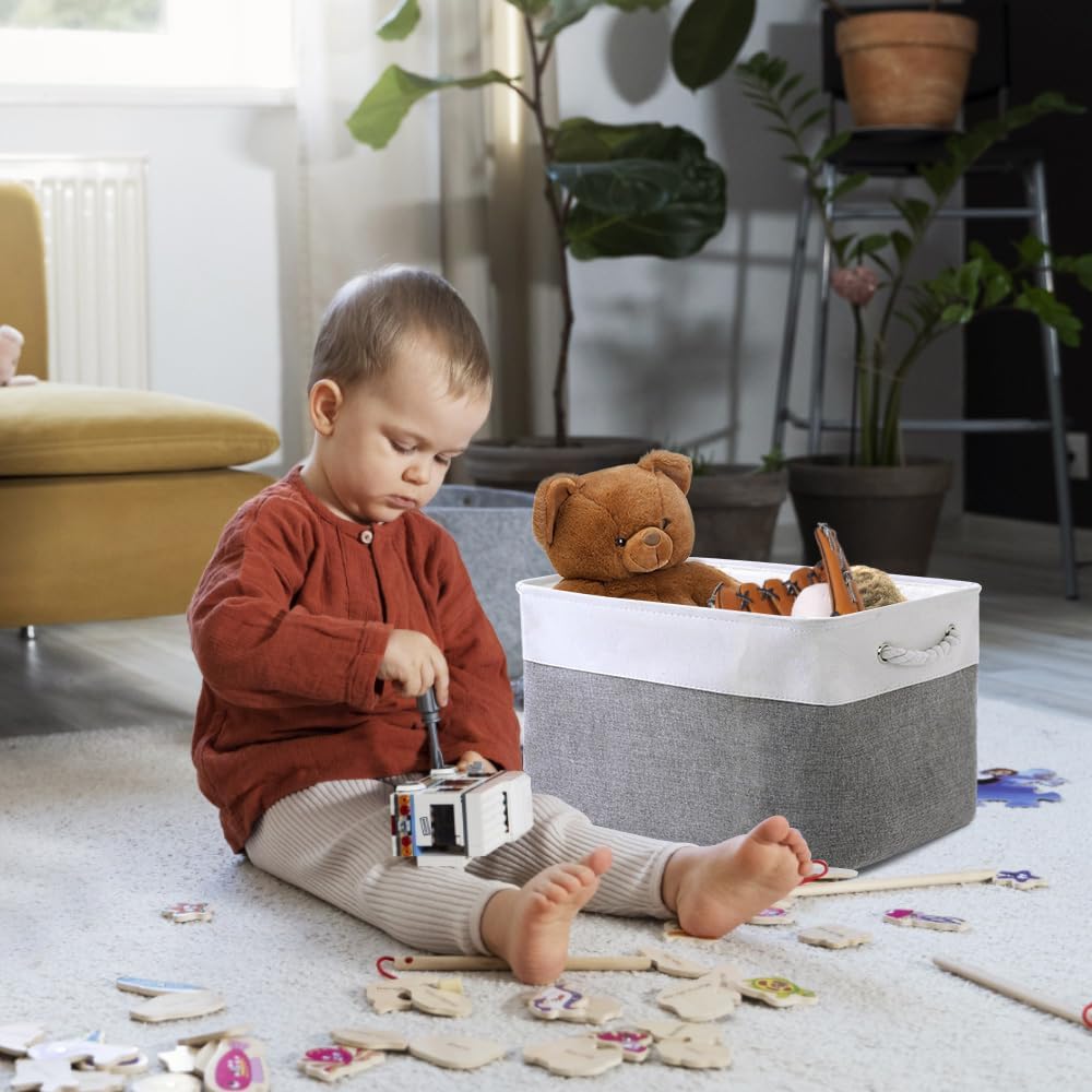 TheWarmHome Organization and Storage Basket for Organizing - 3 Pack 16x12x12 inch Cube Storage Bin Fabric Storage Cubes for Organizer Cloth Gift Toy Closet (White & Grey)