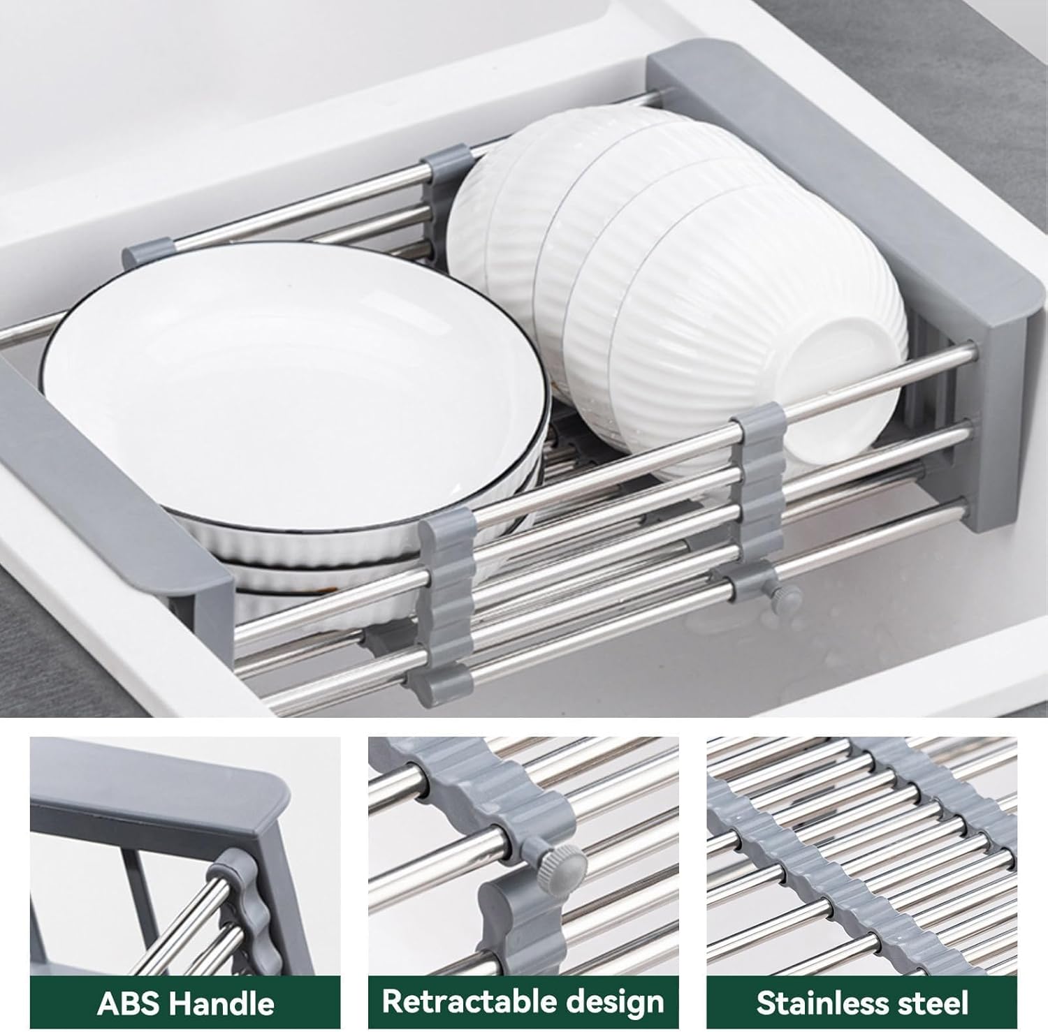 - Retractable Stainless Steel Sink Strainer Drain: Expandable dish drying rack, this over sink strainer adopts stainless steel material, which ensure strong load bearing capacity and long service life