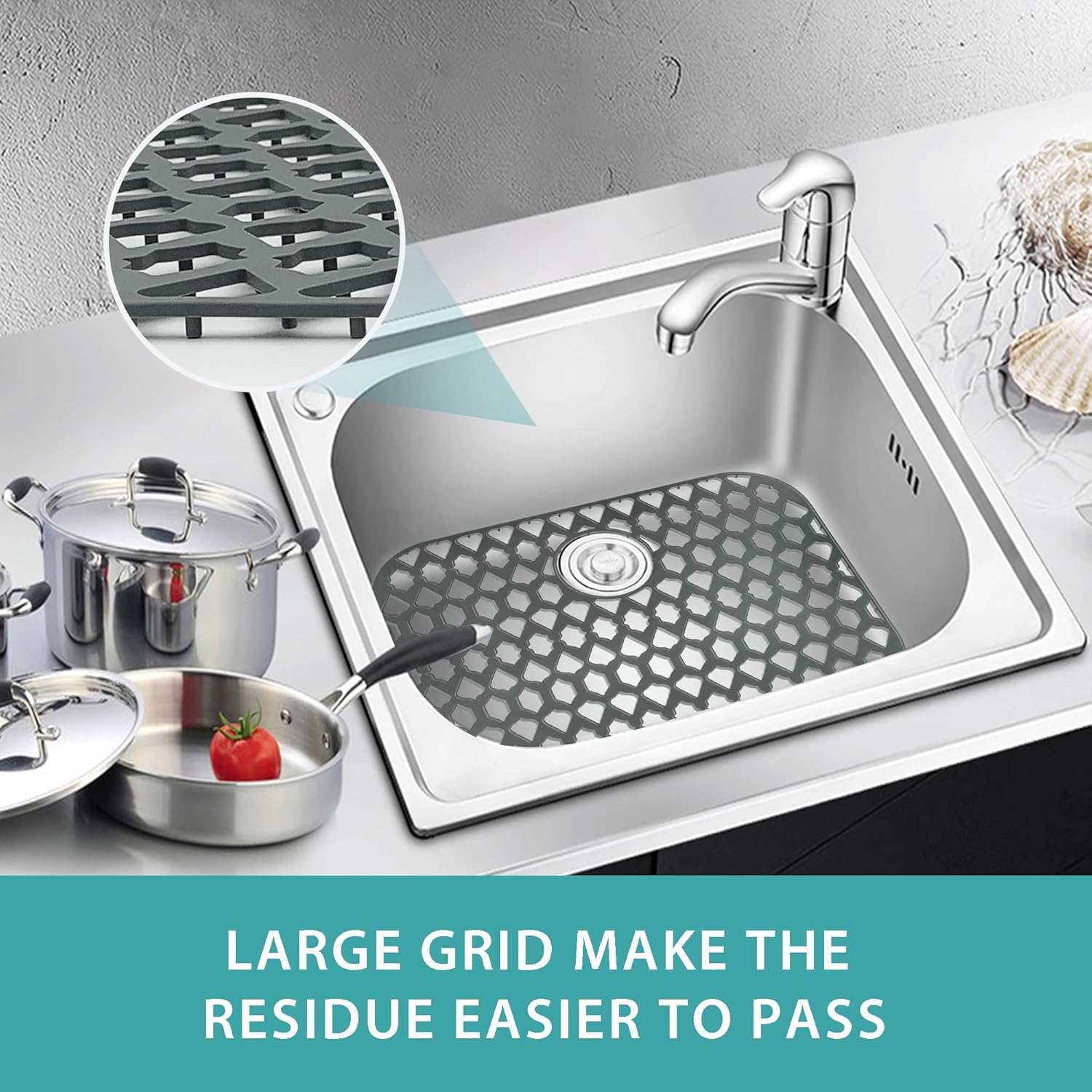 Sink Protectors for Kitchen Sink 13x11 &16x12 &19x14 &21x16 &22x13 &24x13 &26x14 &28x14 &30x16, Large Silicone Sink Mats Grid for Bottom of Farmhouse Sink (21”x16”, Rear Drain)