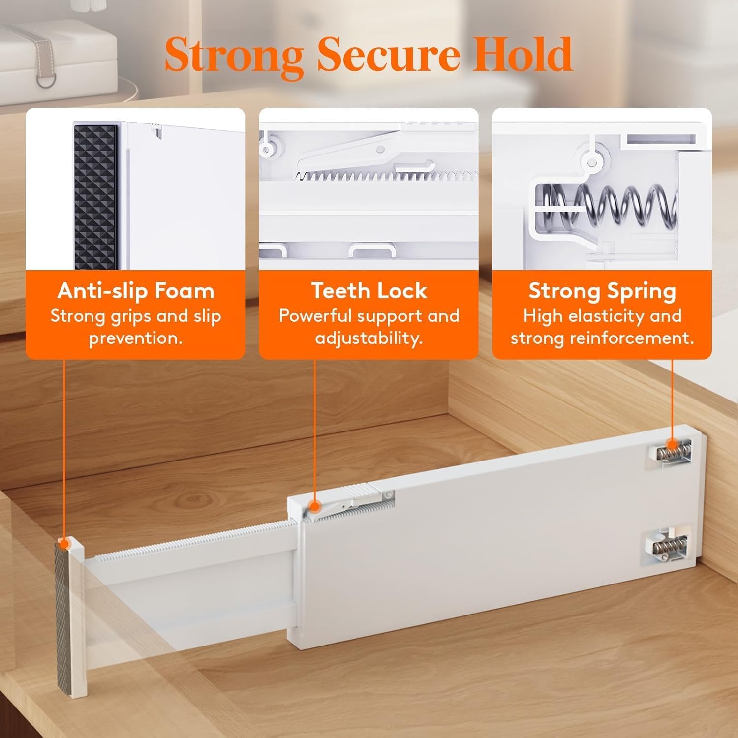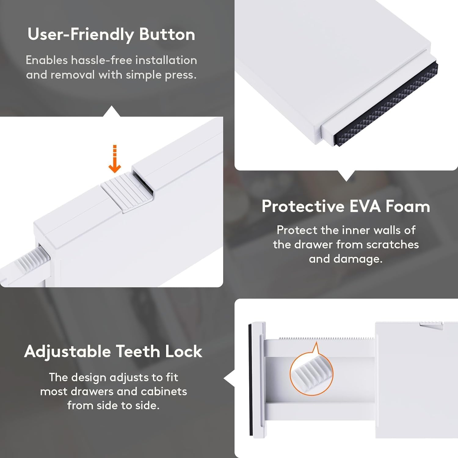 - Easy Installation & Removal: Press the top button to adjust the length before placing, and stretch it out again to secure it tightly before locking it. The strong spring tension keeps each drawer organizer securely upright. To retract, press the top button and push the stretched side.