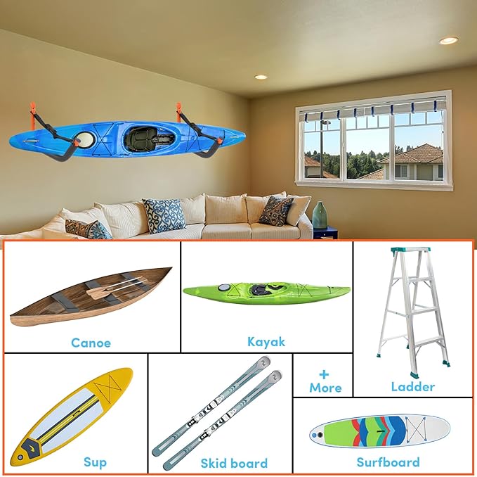 - 【Versatile Storage Options】Kayak storage racks for garage can be used to hang kayak, canoe, SUP, snowboard, skateboard, surfing board.And kayak storage brackets can also be used to store other bulky items such as folding chairs, ladders, bikes, tools, garden hoses, lumber and other bulky items,which is practical and convenient.kayak wall mount with strap can be used to store items indoors and outdoors.