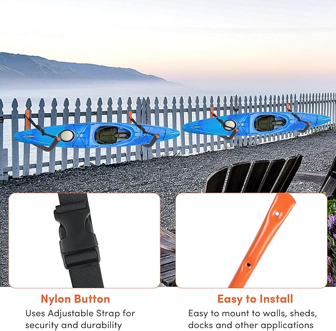 - 【Safe and Reliable】 Each kayak wall rack has a 5mm thick EVA foam protective pad to protect your kayak or stand-up paddle boards from damage due to storage. The 6.6 ft nylon strap and clip included with the garage kayak mount ensure that your kayak is securely secured in place and not easily detached. The sharp edges of the kayak storage rack are covered with rubber, hiding the sharp parts to make it safer and prevent rainwater from entering.