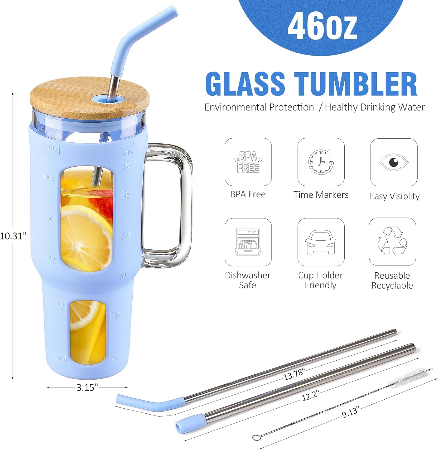 Glass Tumbler with Lid and Straw, 46 oz Iced Coffee Cup with Handle, Large Water Bottles with Silicone Sleeve, Glass Cup with Straws - Pearl Straw & Drinking Straw BPA Free-Glacier