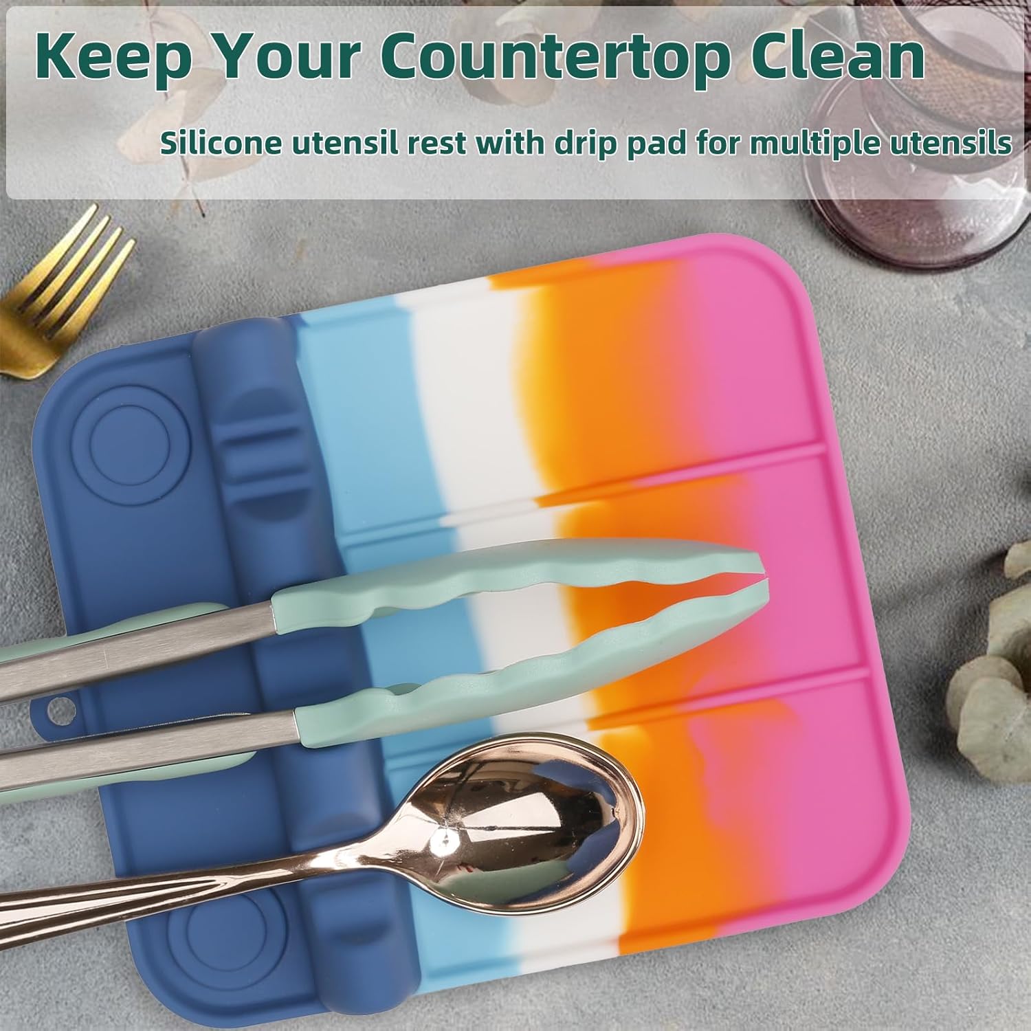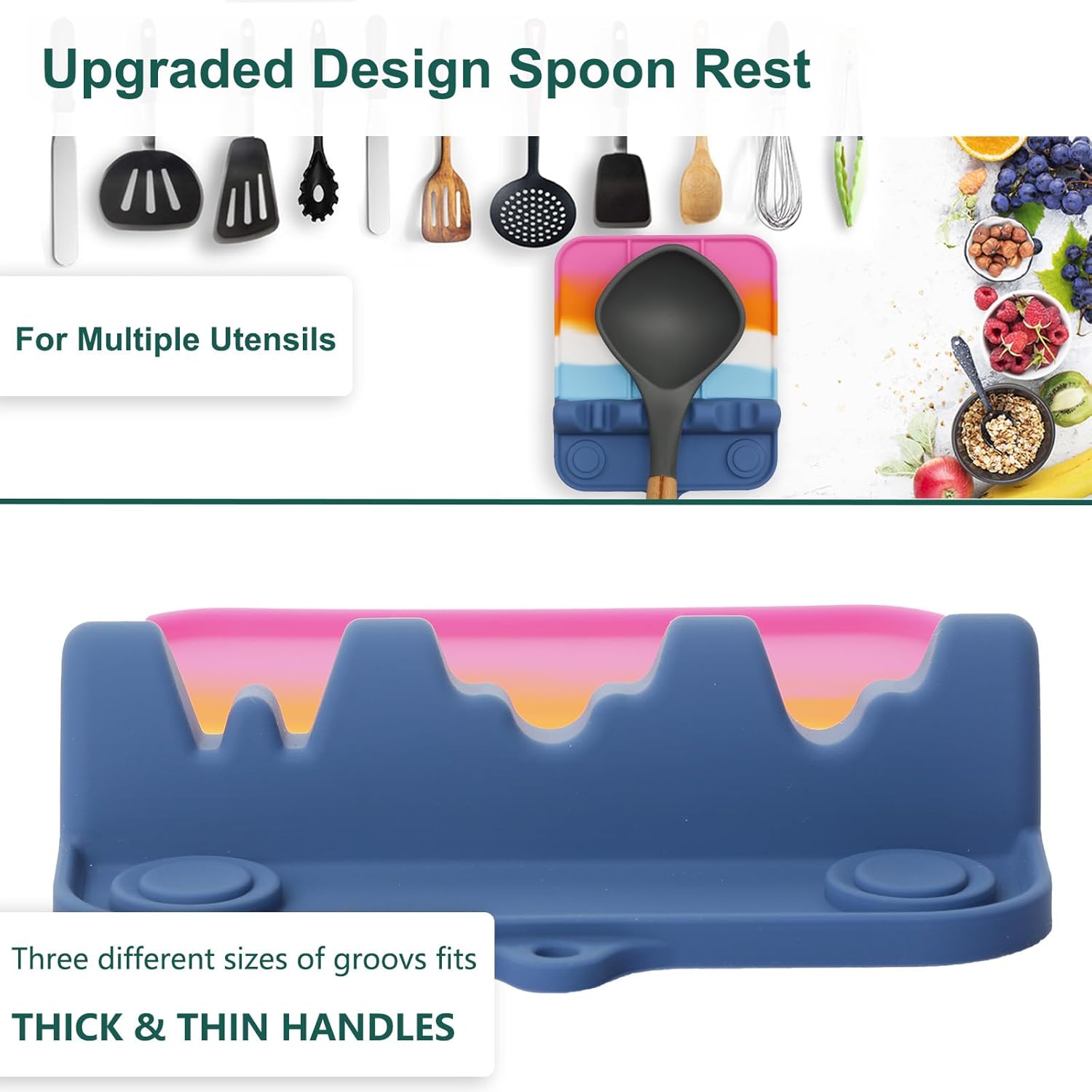- 【HEALTHY & HIGH-QUALITY MATERIALS】This spoon rest is made of 100% food-grade silicone. Compared with plastic or wooden, it’s heat-resistant & eco-friendlier. BPA-free, non-toxic, safe for food. The spoon holder has a longer service life, durable and flexible. With two sucker buttons, it won't slip or slide while in use and can prevent the soup on the spoon or spatula from dripping on the countertop, ensuring a clean and tidy kitchen countertop. Fashionable & unique macaron or rainbow color.