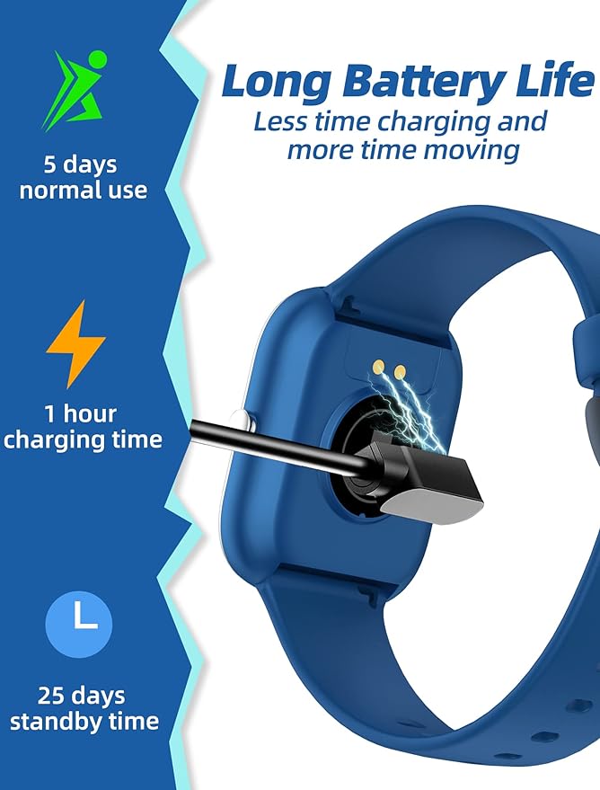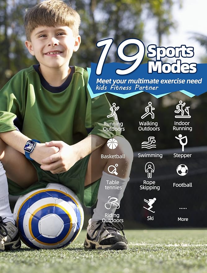 - 【Make Kids Fitness Fun and Build Healthy Habits】All-Day Activity Tracking: Automatically tracks your kids steps, distance and calories burned. Supports 8 activity modes:swimming, running, walking, cycling,yoga, football,basketball,etc. Sedentary reminder, Drink water reminder, Call /SMS /Message reminder, etc., IP68 waterproof, ready play in water.