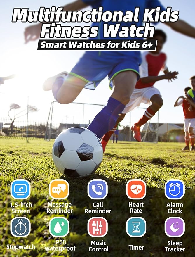 - 【Great Gift for Kids Boys Girls Teens】Kids waterproof smart watch has a fashion and cute design.1.5-inch colorful touch screen can adjust brightness, and the display screen will automatically light up when you raise wrist. it has many fun and useful functions, This will be a great Birthday, New year, Christmas gift for kids, boys girls teens.