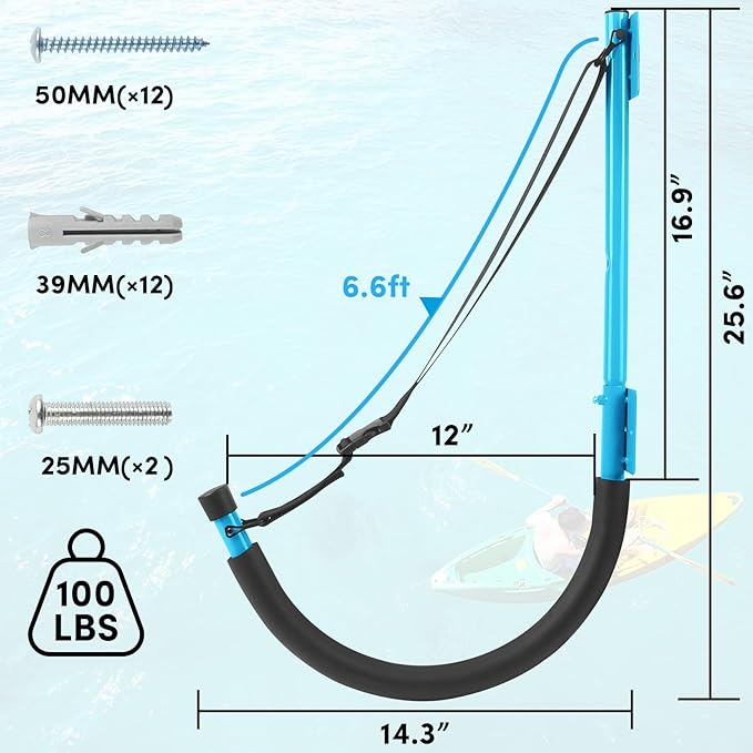 • 【Stronger and Safer】kayak storage rack measures 25.6" x 14.3" . The kayak wall hanger is designed with foam padding , which can well protect storage items from damage or scratch, and locking kayak in place to keep from sliding. kayak wall storage rack adjustable nylon straps measure 6.6 ft, You can adjust the length of the kayak storage hooks strap, make wall-mounted kayak hanger fits the hanging object’s size,and make sure your kayak or stand-up paddleboard will not fall off the rack.