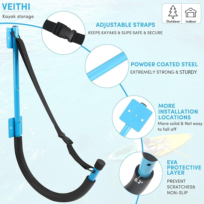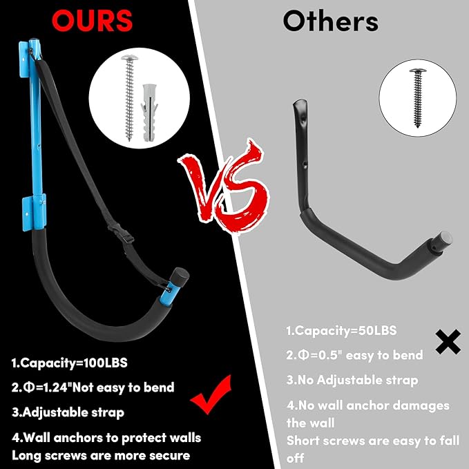 • 【Space-saving Kayak Wall Mount Storage】 The package includes 2 kayak rack storage, 14 screws and 12 anchors, the updated screws are longer and stronger . Kayak wall mount hooks Suitable for indoor or outdoor use in the garage, shop or home. Kayak hanging rack fit neatly on drywall, wall studs, and other wall types, freeing up space on the ground.