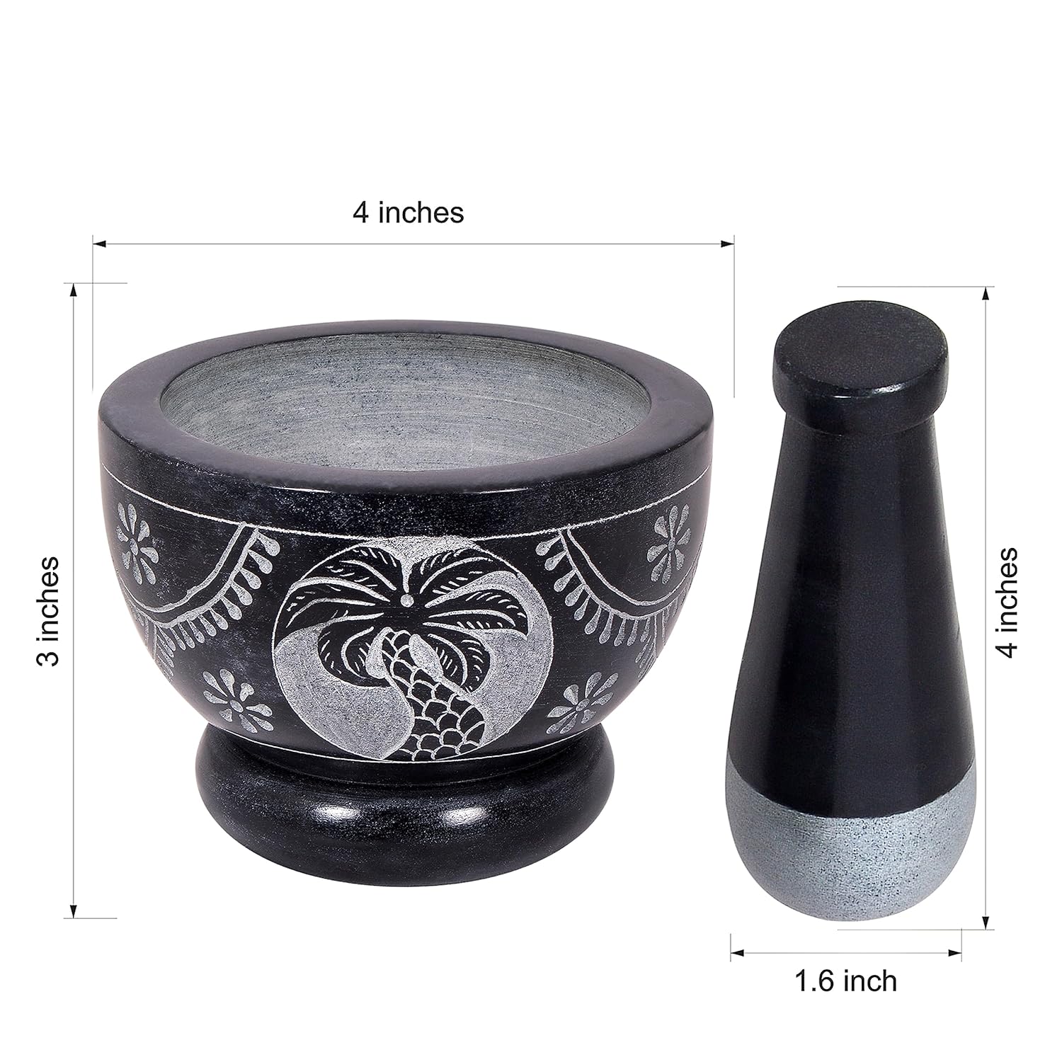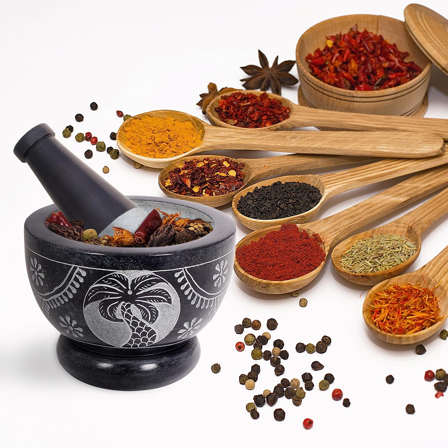 - THE PERFECT BLEND OF FORM AND FUNCTION! - The mortar and pestle have been used for centuries as the perfect way to grind and mix ingredients. Elevate your kitchen aesthetics and culinary experience with our black mortar pestle, adorned with an intricately engraved palm tree design.