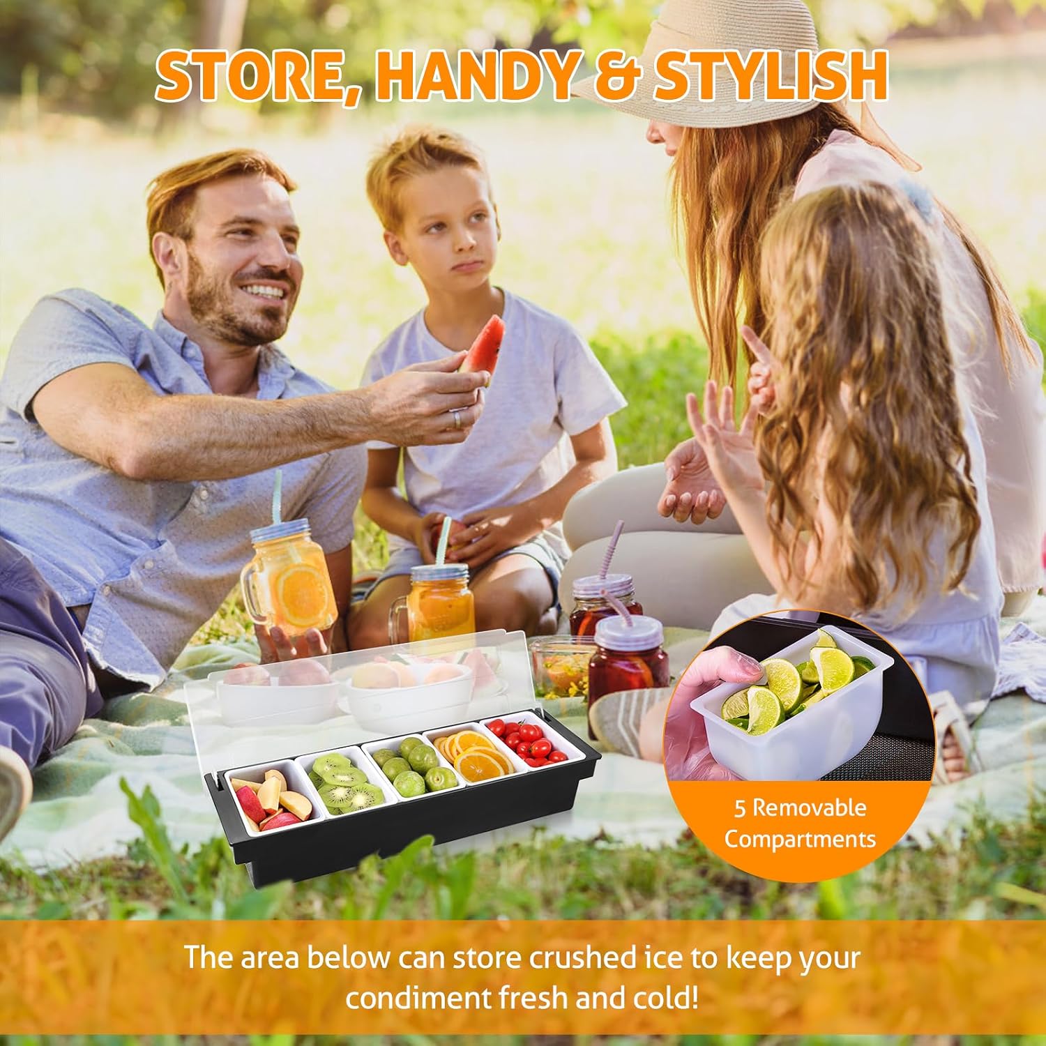 - ORGANIZE CONDIMENTS & GARNISHES - Our portable caddy has multi trays that have enough space to hold party food items, such as olives, pickles, fruit slices, nuts, seeds, gray, sauces and salad dips.