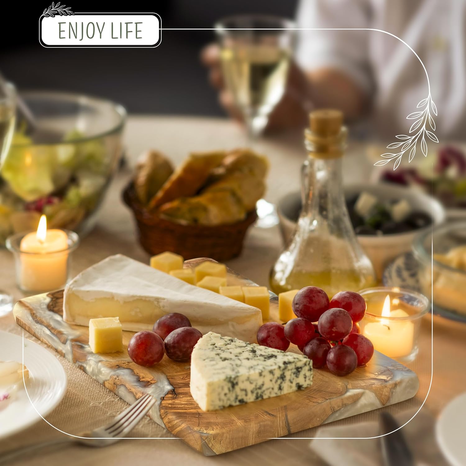 - Beautifully Designed Unique And Durable: Our rustic live edge wood cutting board for kitchen have its own uniquely stunning olive wood grain. Dimensions, colors, shapes and wood grain patterns of natural resin cheese boards charcuterie boards may slightly vary due to the distinctive properties of each olive tree. Our sturdy and practical nice wood cheese board beach can be used as charcuterie kitchen accessories, served as a unique cutting boards for kitchen decor.