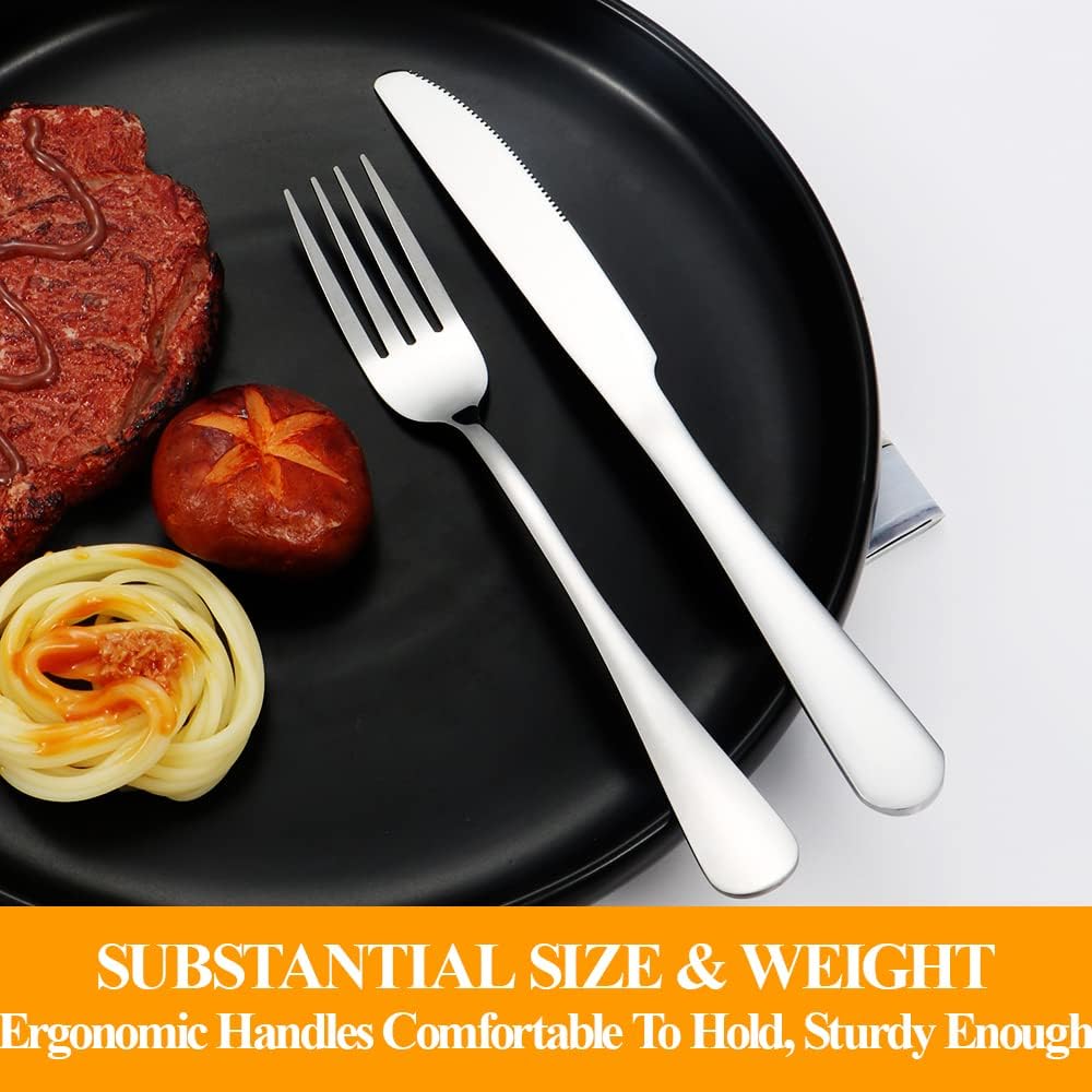 - ✅ MEDIUM WEIGHT AND COMFORTABLE HANDLE---Flatware sets not too heavy or too light, the sizes and shapes are carefully designed, will fit the hand very well-they don't get tiresome to hold. Each utensil is well balanced, has a beautiful polished stainless finish, the smooth surfaces make the flat ware very comfy for you to eat with, so the hand-feel is good.