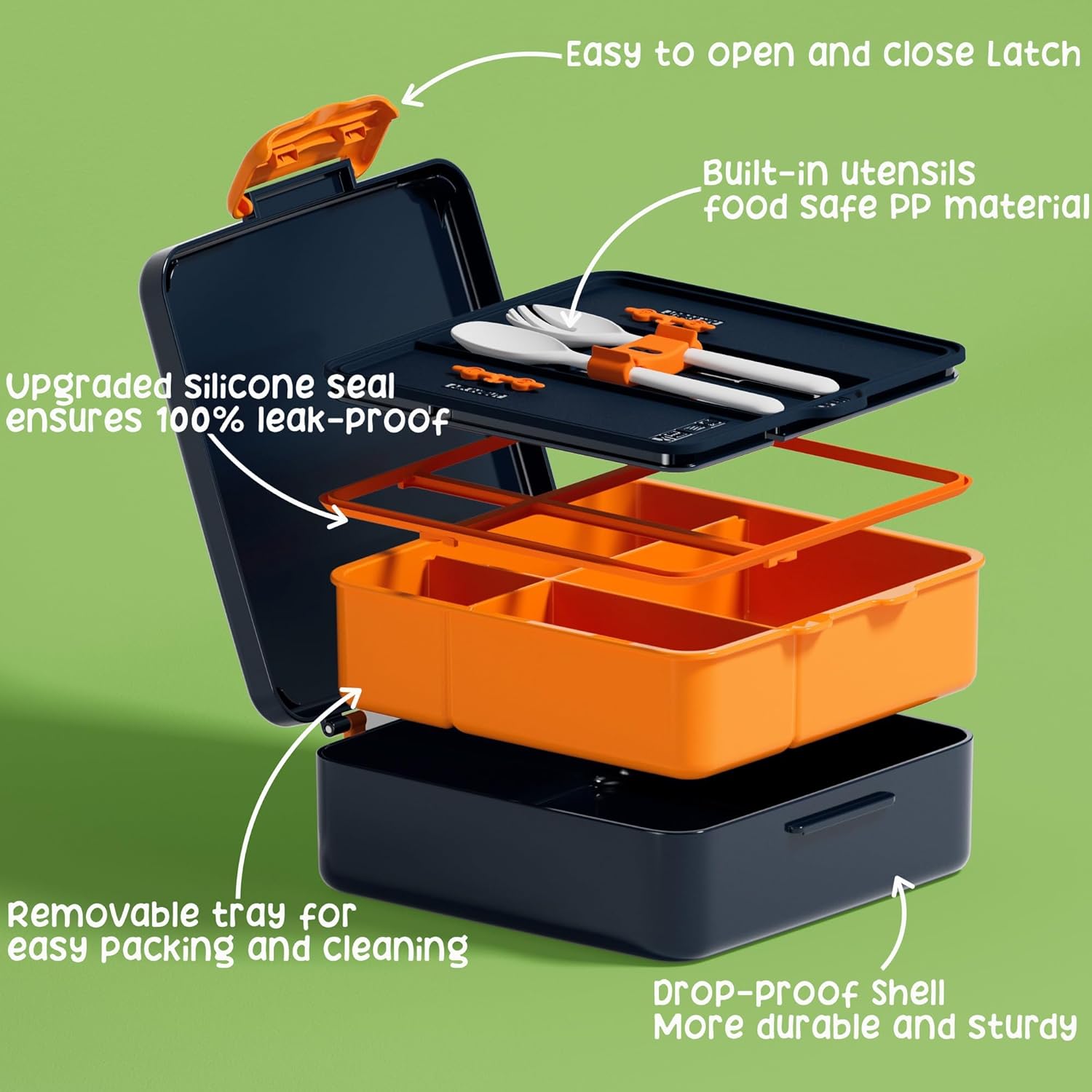 - PREMIUM BENTO LUNCH BOX: This Kids bento sanck box is designed with airtight lids & 4 individual seal compartments to keep foods separate/fresh, allowing you pack a balanced meal with ease. The bento box is Tray Top Rack Dishwasher Safe ( under 80℃) & freezer safe, and its food tray is microwave safe for on-the-go parents. Comes with its own set of utensils that snap right onto the lid for easy storage. Kids friendly latches designed & vent plug design, easy for kids small hands to open & close