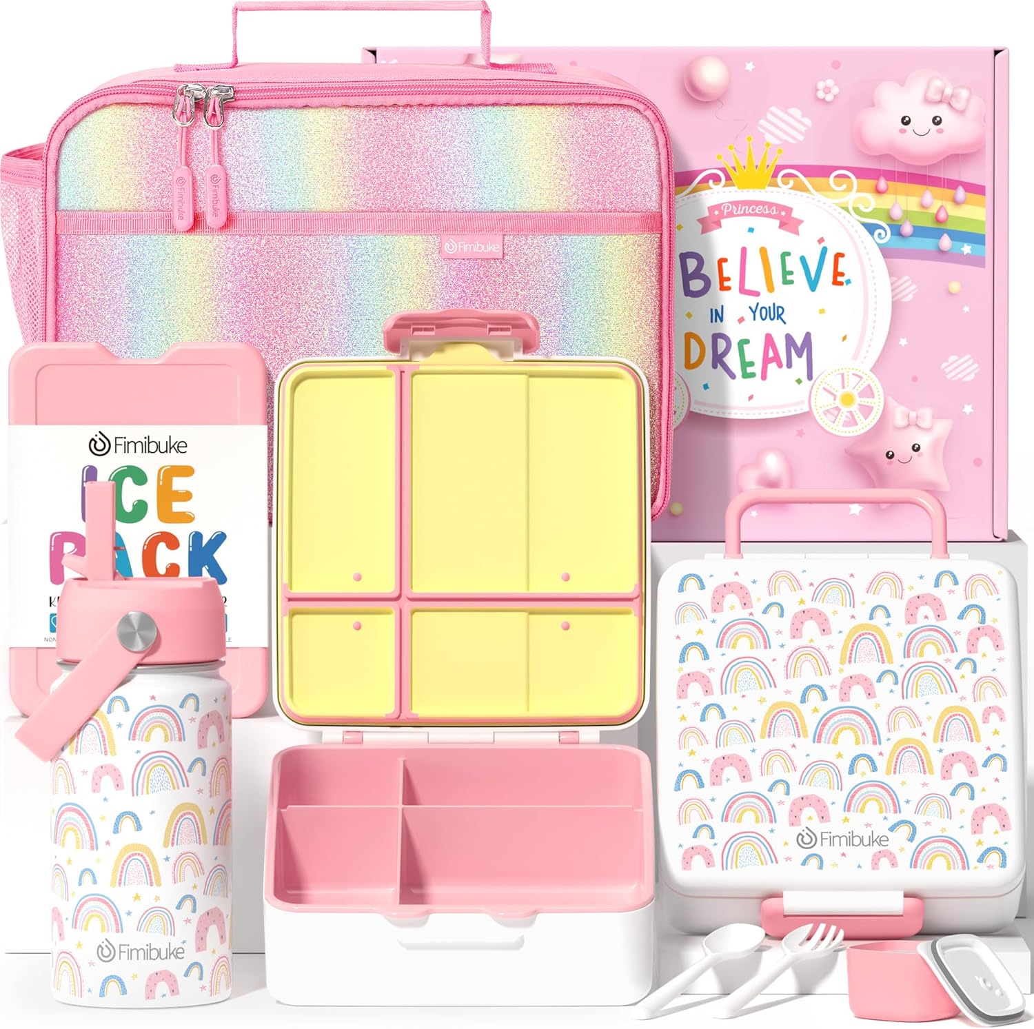 Fimibuke Kids Bento Lunch Box with 4 Compartments, Insulated lunch Bag, Stainless Steel Insulated Water Bottle, Ice Pack & Utensils Set, Birthday Gifts for Ages 3-12 Back to School Toddler Girls Boys