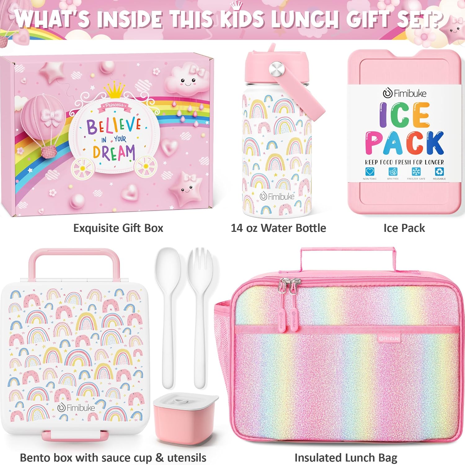 - 7PCS KIDS SCHOOL LUNCH BOX GIFT SET: Fimibuke kids lunch box set provides an one-stop solution for kids school lunch or snacks packing and carrying, this all combined gifts box comes with a 100% leak-proof bento box, a 14oz water bottle insulated, a kids insulated lunch bag, an ice pack, a sauce jar, a set of utensils and an exquisite gift box. Perfect for ages 3-12 kids to daycare, nursery school, preschool, kindergarten, elementary school, back to school or summer camp with a healthy lunch