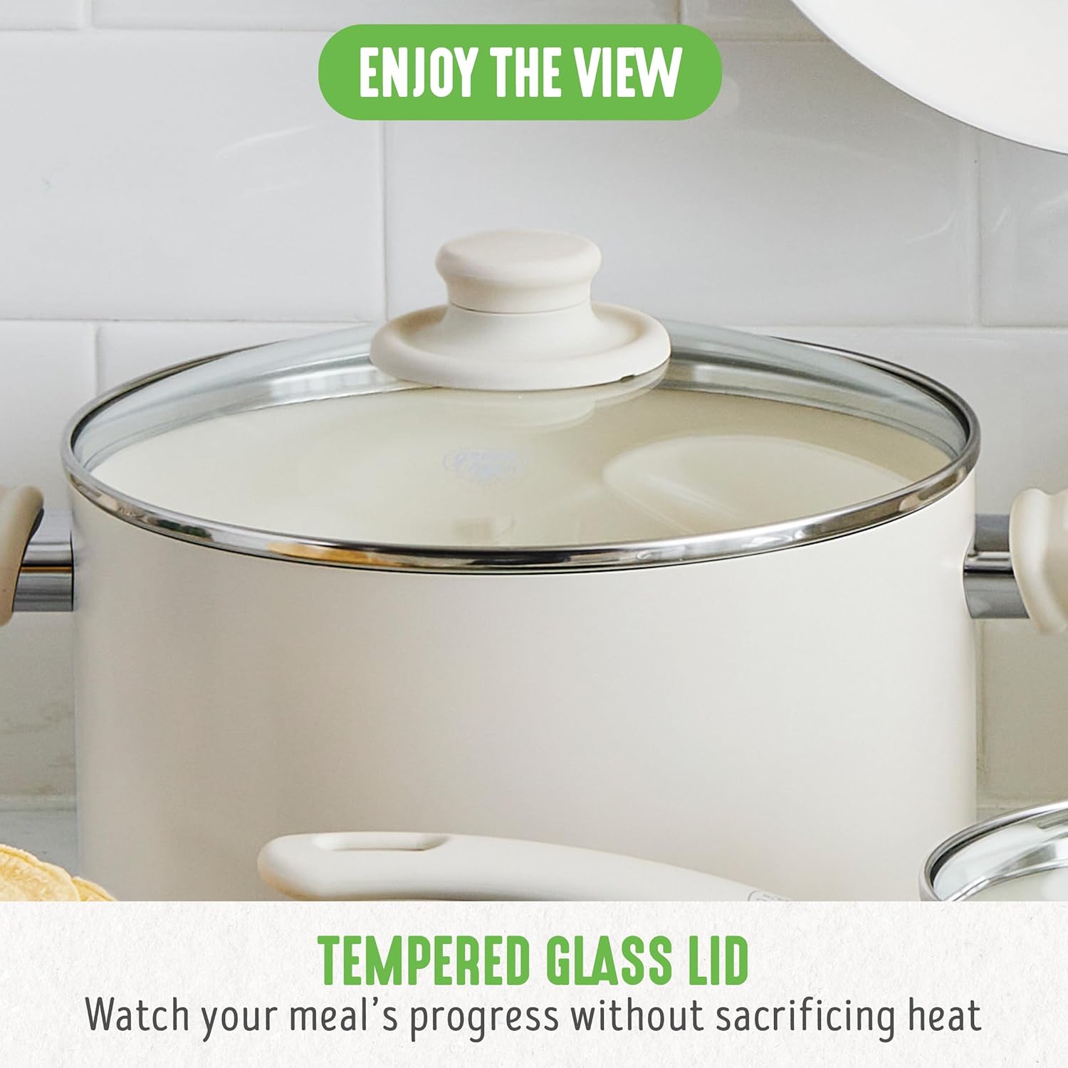 GreenLife Soft Grip 16 Piece Cookware Set, Non-Toxic PFAS-Free Ceramic Nonstick, Frying, Sauce, Saute, Utensils, Glass Lids, Stay-Cool Handles, Wobble Free, Dishwasher & Oven Safe, Cream