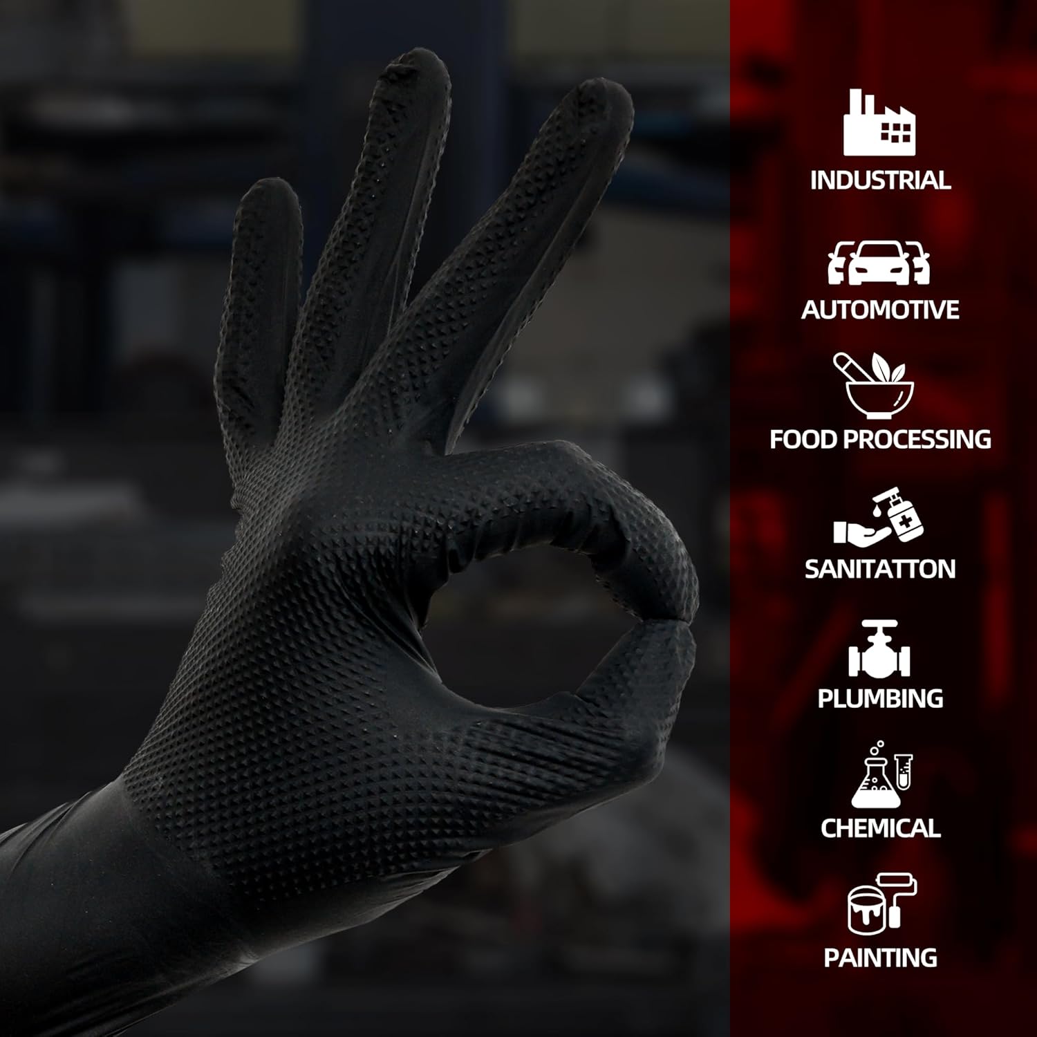- High Visibility: The vibrant black nitrile gloves enhance visibility in dimly lit environments, significantly improving safety during heavy-duty tasks in mechanics, automotive, construction, and manufacturing industries