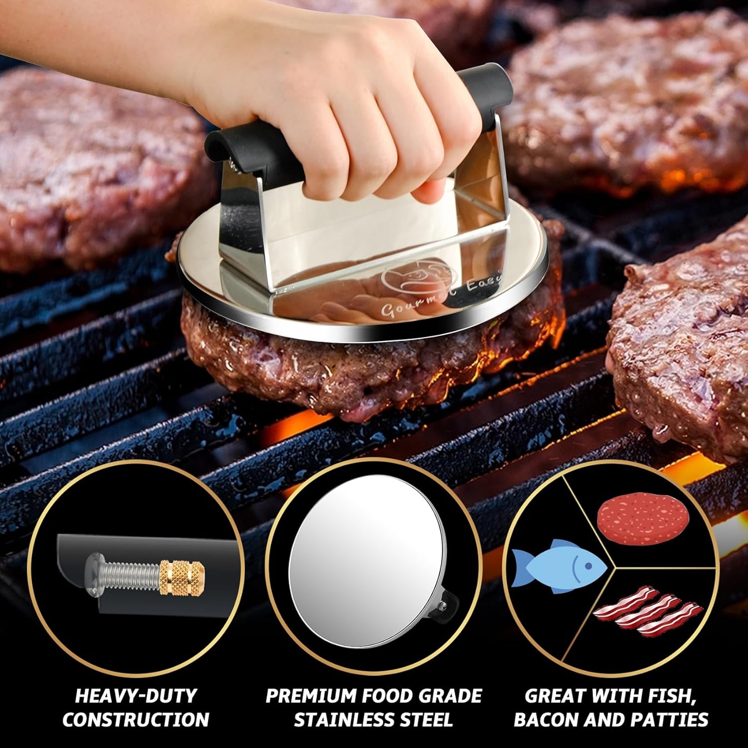 - STAINLESS STEEL 304 BUILT TO LAST: Get ready to gift a tough and well-built hamburger smasher tool! It is made from durable stainless steel. NO MORE RUST! Comes with a silicone handle to help you apply pressure to the food easily & safely. Create restaurant-quality burgers at home!