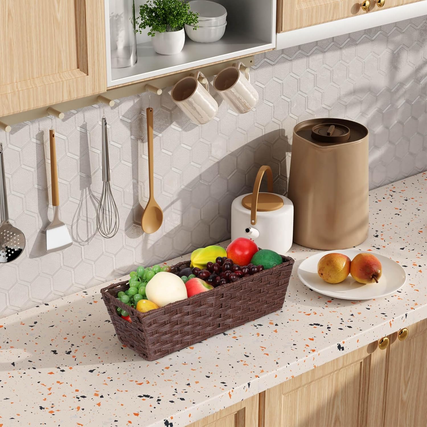 - MULTIFUNCTION: Baskets are good for kitchen, restroom, bathroom, bedroom, living room. For storing hand towels, toiletries, toilet roll, fruits, veggies, snacks, keys, remotes, charging cable and other household items.
