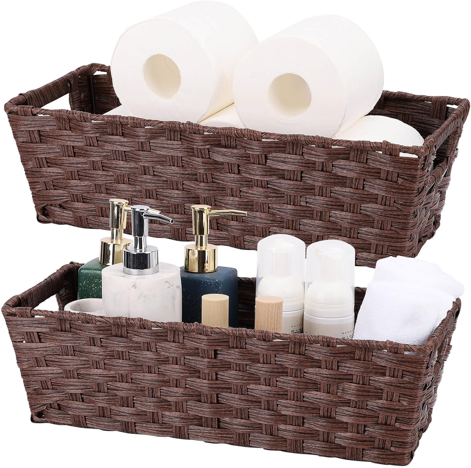 Plastic Wicker Storage Baskets - Toilet Tank & Bathroom Baskets, Woven for Organizing, Brown, 15¾" x 6¾" x 4¾", 2-Pack