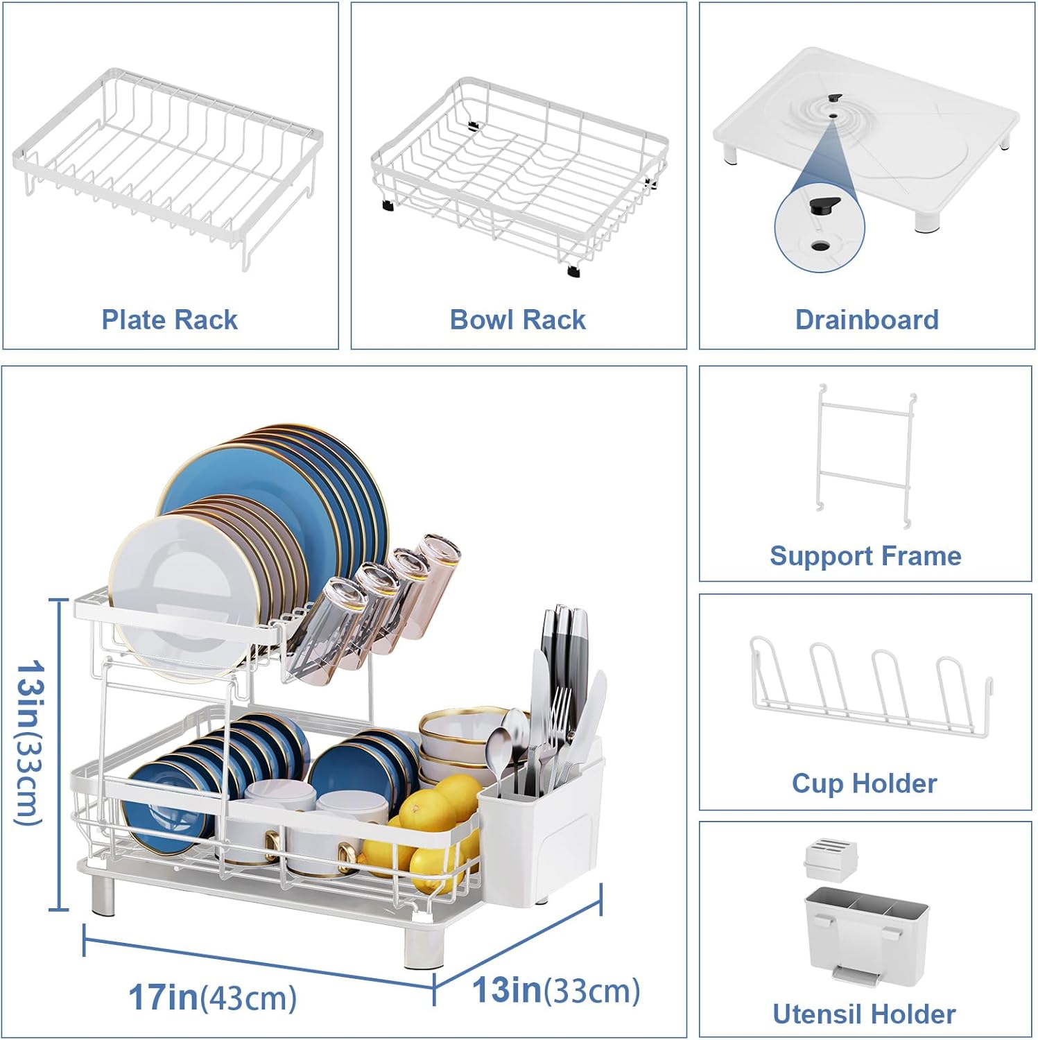 MOUKABAL Dish Drying Rack, 2 Tier Dish Rack, Large Dish Racks for Kitchen Counter, Dish Drainer with Removable Utensil Holder, Drainboard (White)