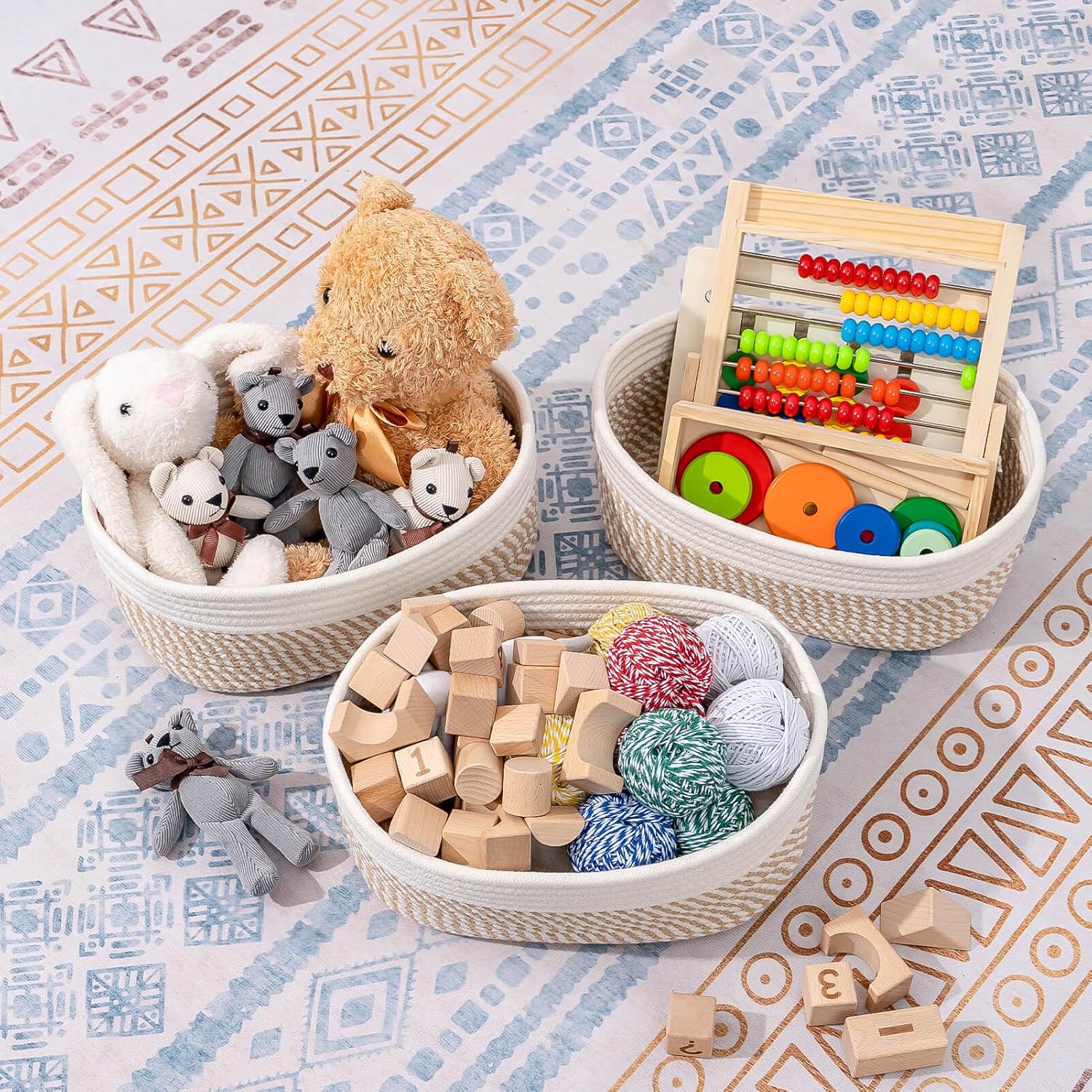 - Classy Natural Cotton Rope Storage Baskets-High quality well made. Very sturdy and a cute modern style. Durable woven rope, Long-lasting, skin-friendly, soft and attractive. You need these adorable baskets to put some supplies in, diaper, jewelry, cosmetics, makeup brushes, tea bags, storing smaller toys, toddler socks, candy
