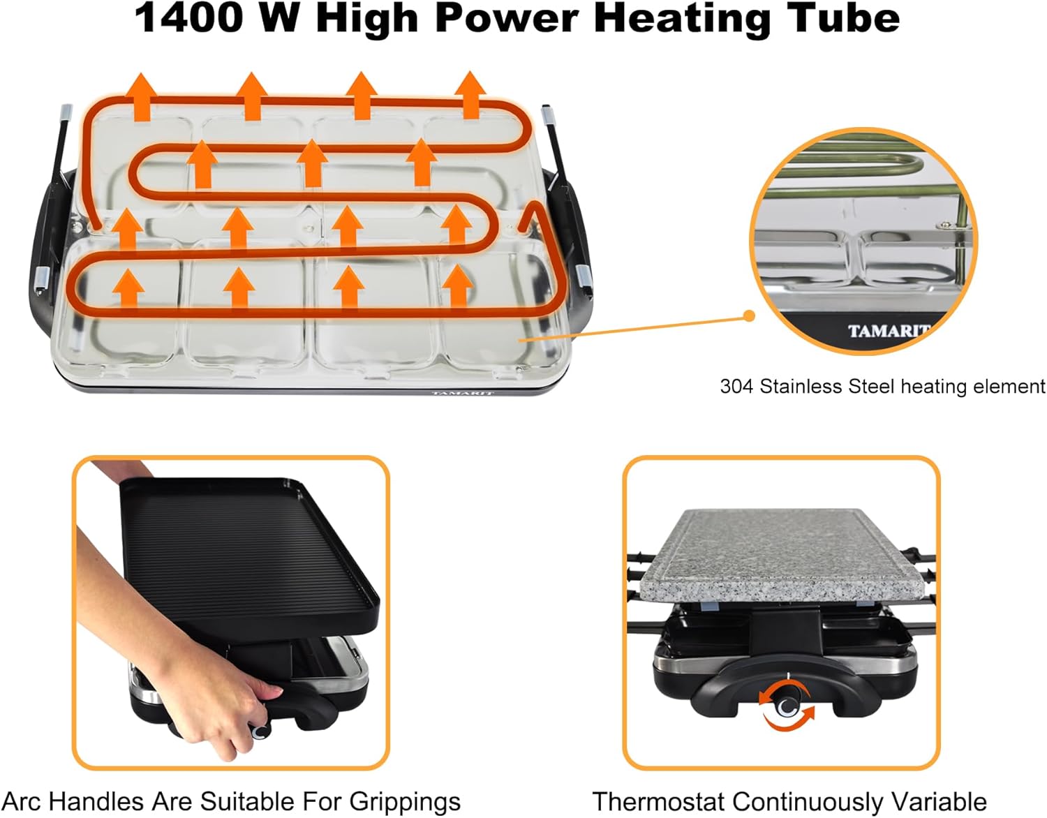 TAMARIT Raclette Table Grill Portable 3 in 1 Korean Barbecue BBQ Grill Electric Indoor Grill with Non-Stick Reversible Grilling Plate & Cooking Stone for Steak 1400W Raclette Grill for 8 Person, Black