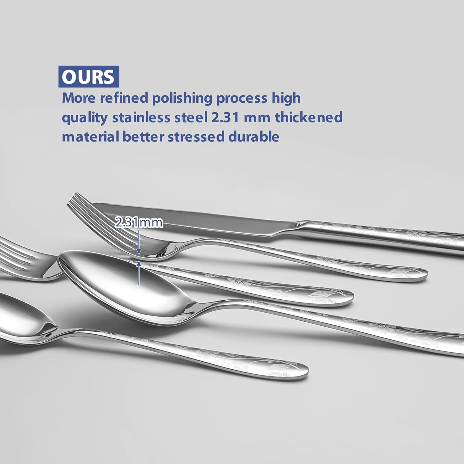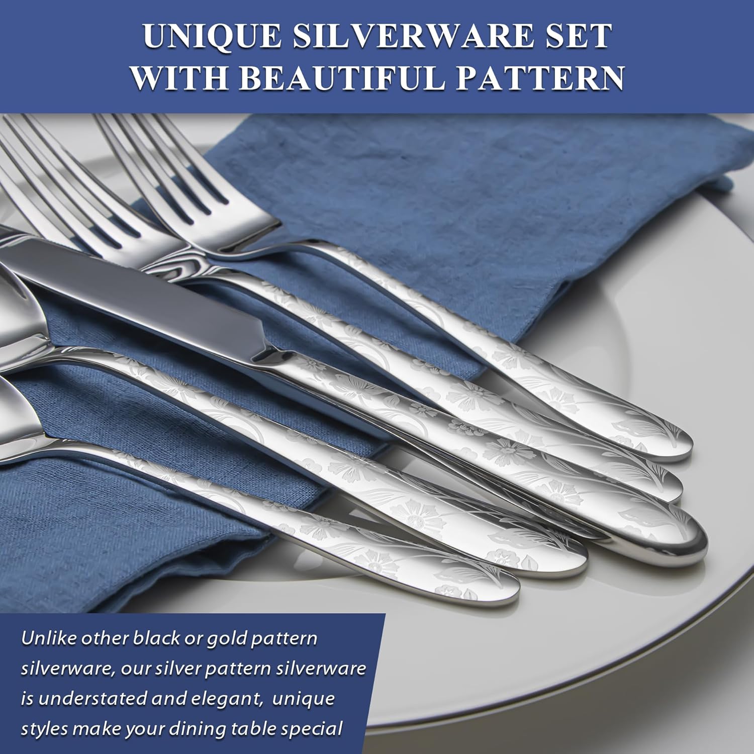 - 【Unique Silverware Set with Beautiful Pattern Handle】Our flatware set for 8 is designed with beautiful laser prints of flowers, unique styles make your dining table special, standing out from the ordinary tableware, and unique silver finish pattern design brings modern and stylish to the modern silverware set impresses your family and friends when they come round for dinner