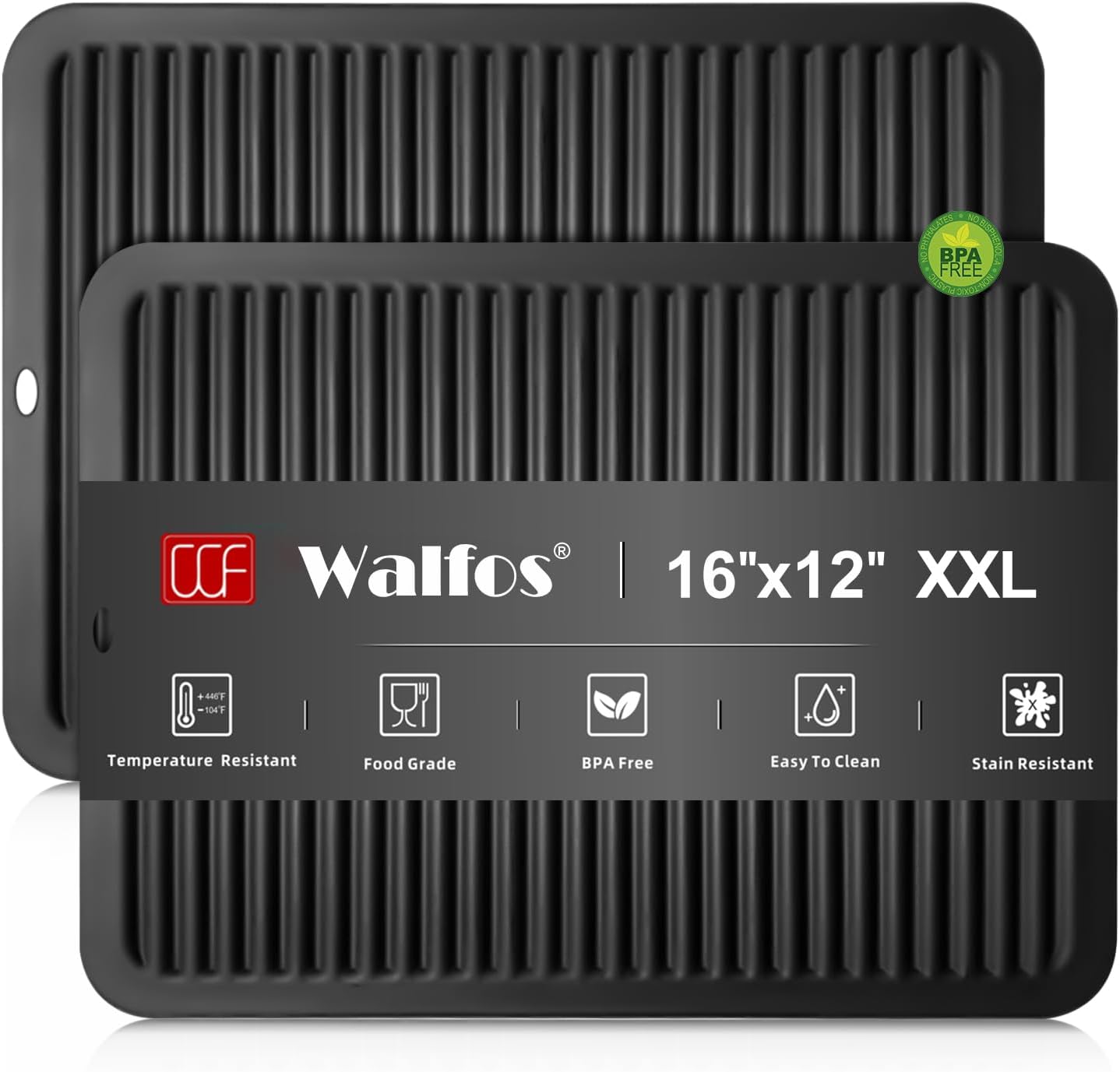 - 16 INCH LARGE SILICONE TRIVET: Walfos extra large trivet allows you to better prevent large hot dishes, pots, appliances, etc. from scalding your countertop, preventing spills and keeping your countertops organized. Made from food-grade silicone, Walfos pot holders are BPA-free and will not attract odors, stain, rust or crack. Size: 16'' x 12'' x 0.22''
