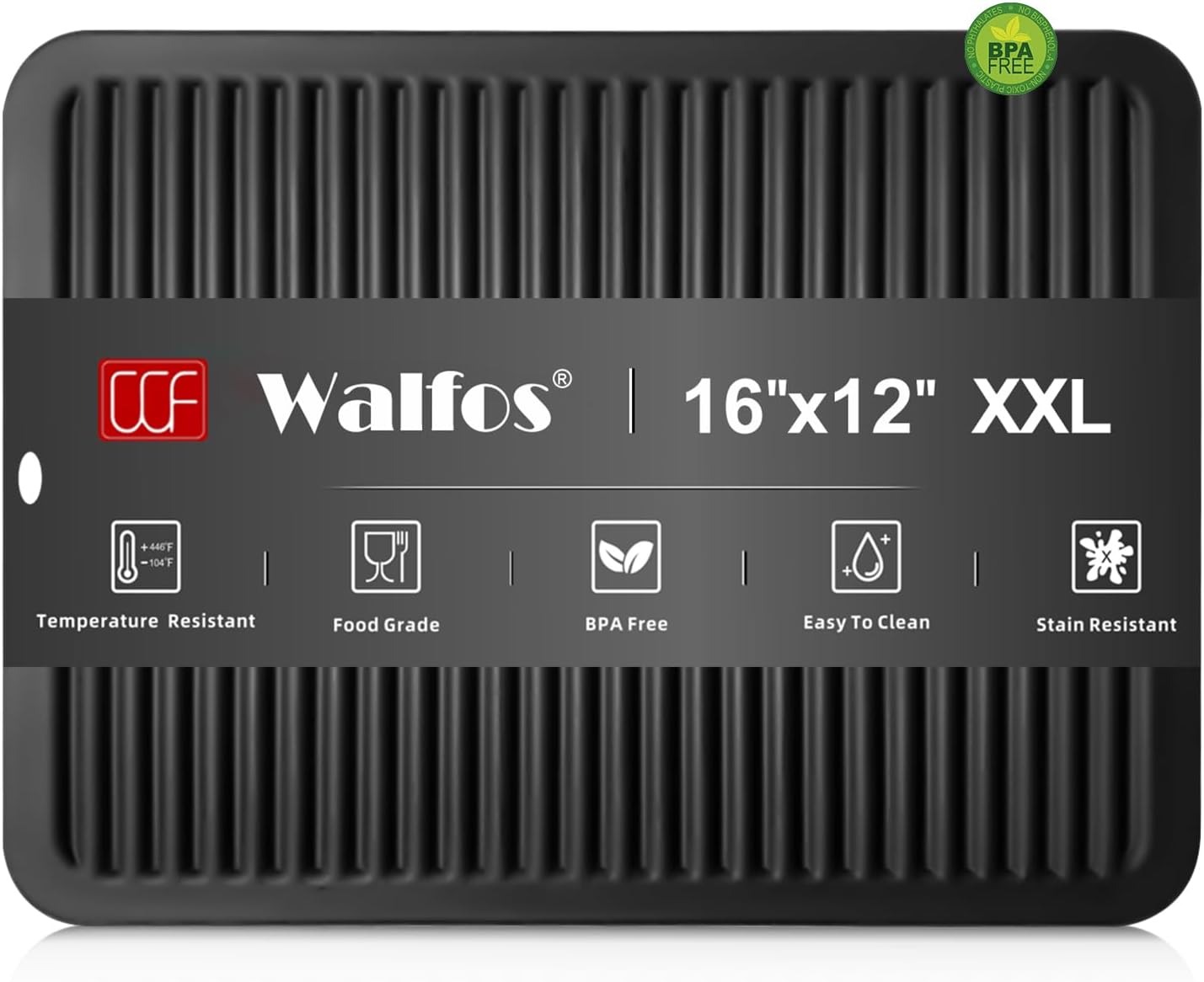 - 16 INCH LARGE SILICONE TRIVET: Walfos extra large trivet allows you to better prevent large hot dishes, pots, appliances, etc. from scalding your countertop, preventing spills and keeping your countertops organized. Made from food-grade silicone, Walfos pot holders are BPA-free and will not attract odors, stain, rust or crack. Size: 16'' x 12'' x 0.22''