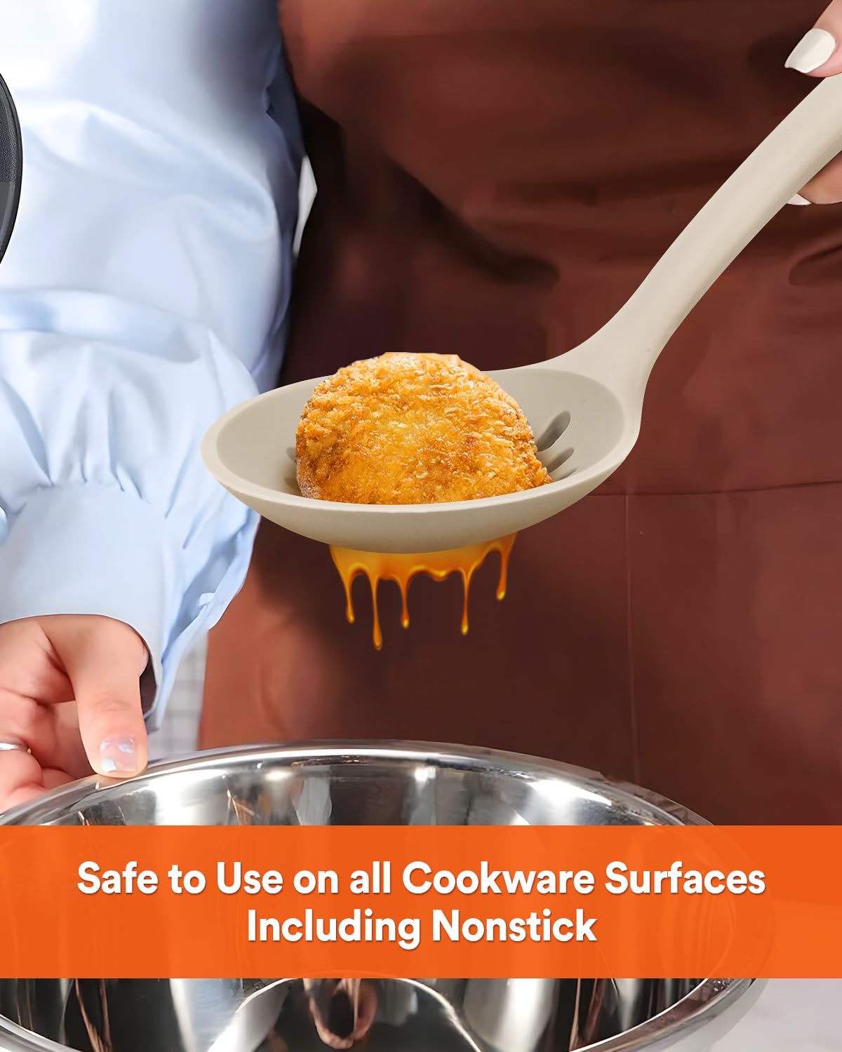 Kitchen Ladle Strainer, Large Slotted Spoon with High Heat Resistant BPA Free, Non Stick Cooking Skimmers For Draining & Frying, 13.2inch (Khaki)