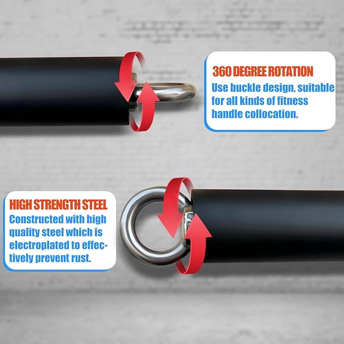 - Special Design: There are two stainless hooks on both ends of this straight bar, you can connect them to a dual cable machine or resistance bands to do multiple strength training. The 360 swivel can support to workout exercise push down, press down, rows and curls, without wrenching your wrists.