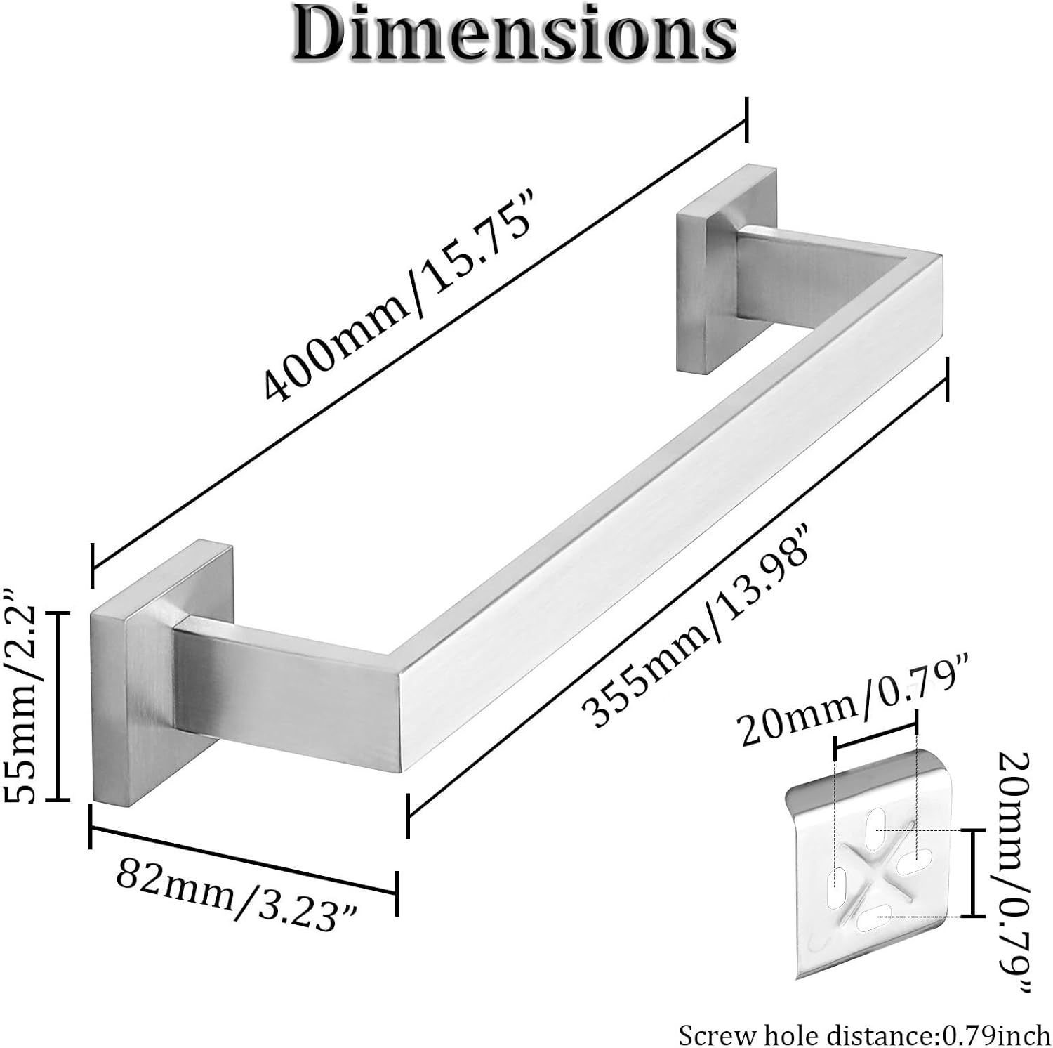 - 【Measure Before Buying】Dimensions 15.75''Lx2.2''Wx3.23''H, Useable Length 13.98 Inch towel hanger. 2.8 Inch Separation Distance from Wall - Enough space for quick drying, hanging towel quickly.No need to fold your towel any more.If you have any questions about the brushed nickel towel bar, please feel free to contact me at any time