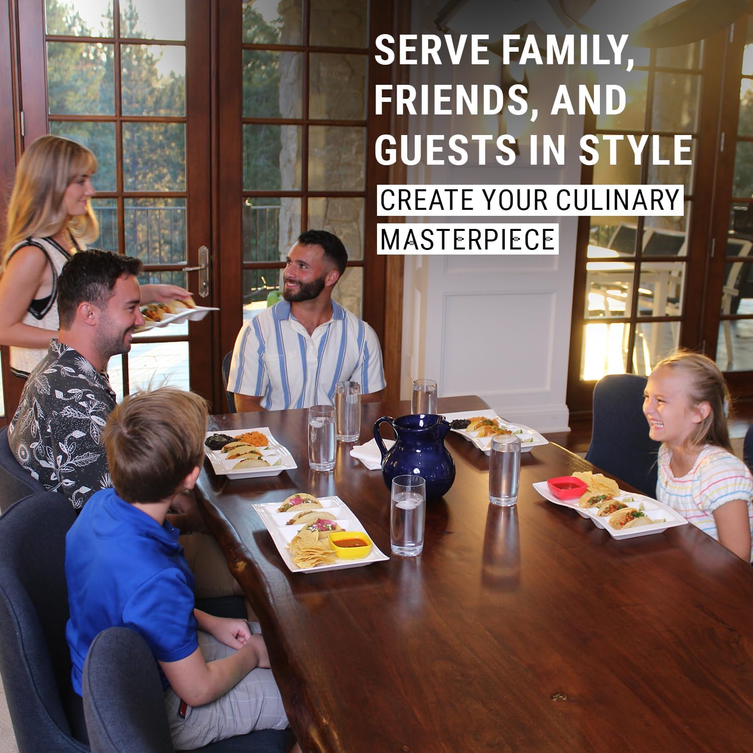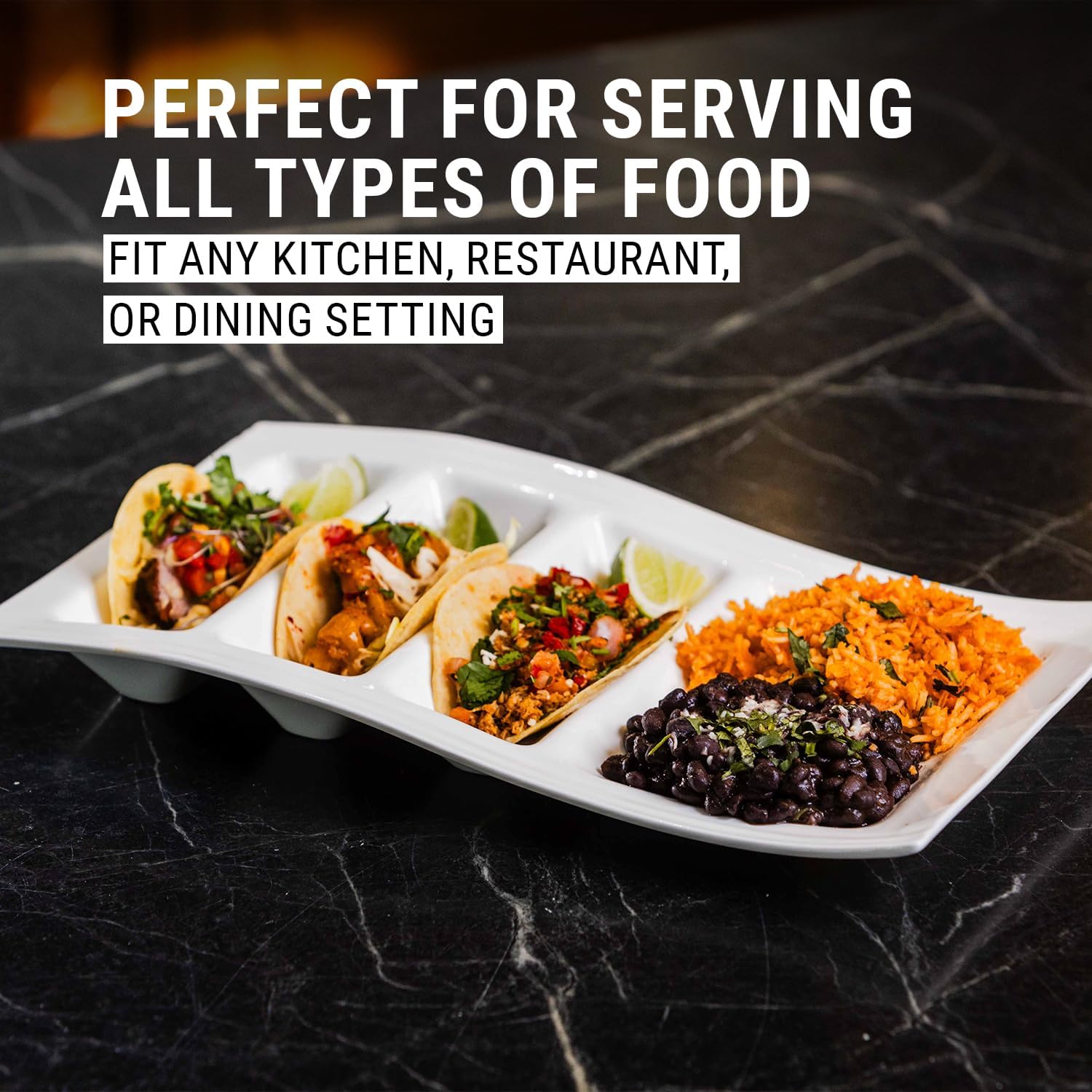 - [Fine Dining] The plate is versatile and can be used for tacos, sushi, veggies, desserts, chip and dip, entree, appetizers, and countless other meals. Every meal can appear as a culinary masterpiece on this attractive china serving dish. Besides tacos and entrees, use the stylish plate as a serving platter for snacks, relish foods, condiments, food prep station, desserts, candy dish and so much more. It can be used for breakfast, lunch, dinner, snack time or parties.