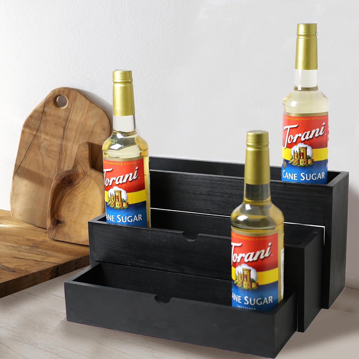 Black Wood Coffee Syrup Rack Organizer, 3-Tier Separated Bottle Holder for Coffee Bar, 12 Bottle(750ml) Storage Stand for Syrup, Wine, Dressing