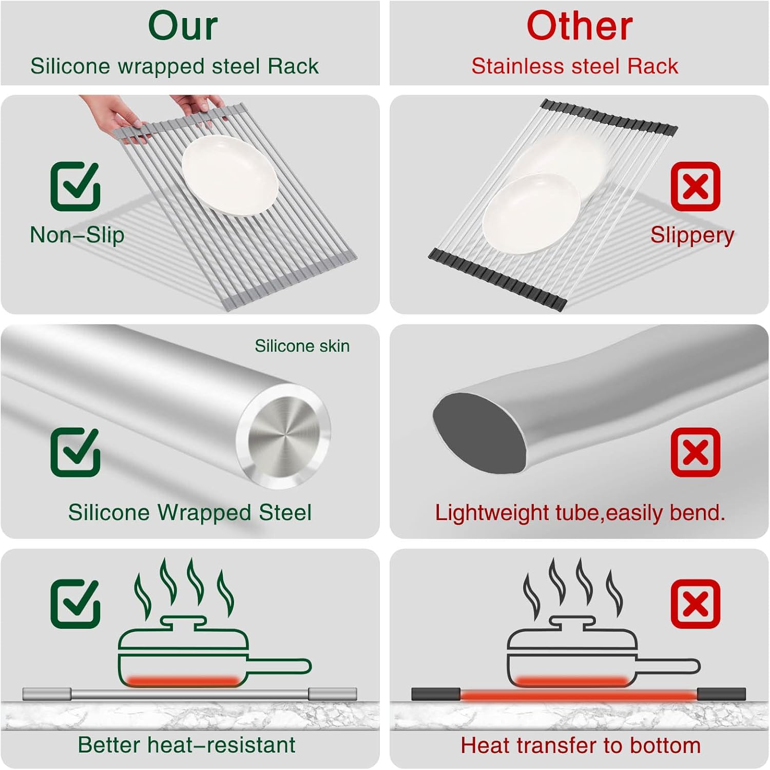 - ✔️ HEAT RESISTANT AND DURABLE: Made of high-quality 18 bars that are coated with silicone, Heat resistant up to 400°F (204°C),Resistant to rust, non-slip, durable, glassware friendly,and sturdier than stainless steel racks.Oil-resistant, very easy to clean. Collapsible, and rolls up for easy storage.