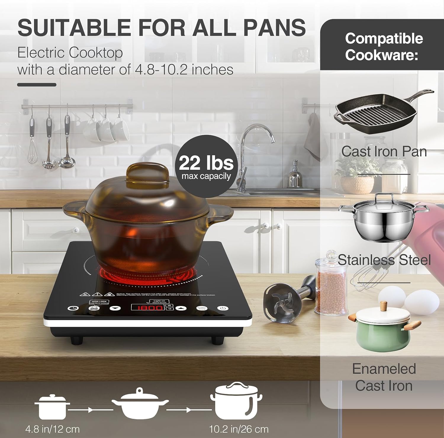- Compatible with All Kinds of Kitchenware: The electric cooktop uses infrared rays for heating, so you don't have to worry about the suitability of your pots and pans, and you can choose your favorite pots and pans for cooking.