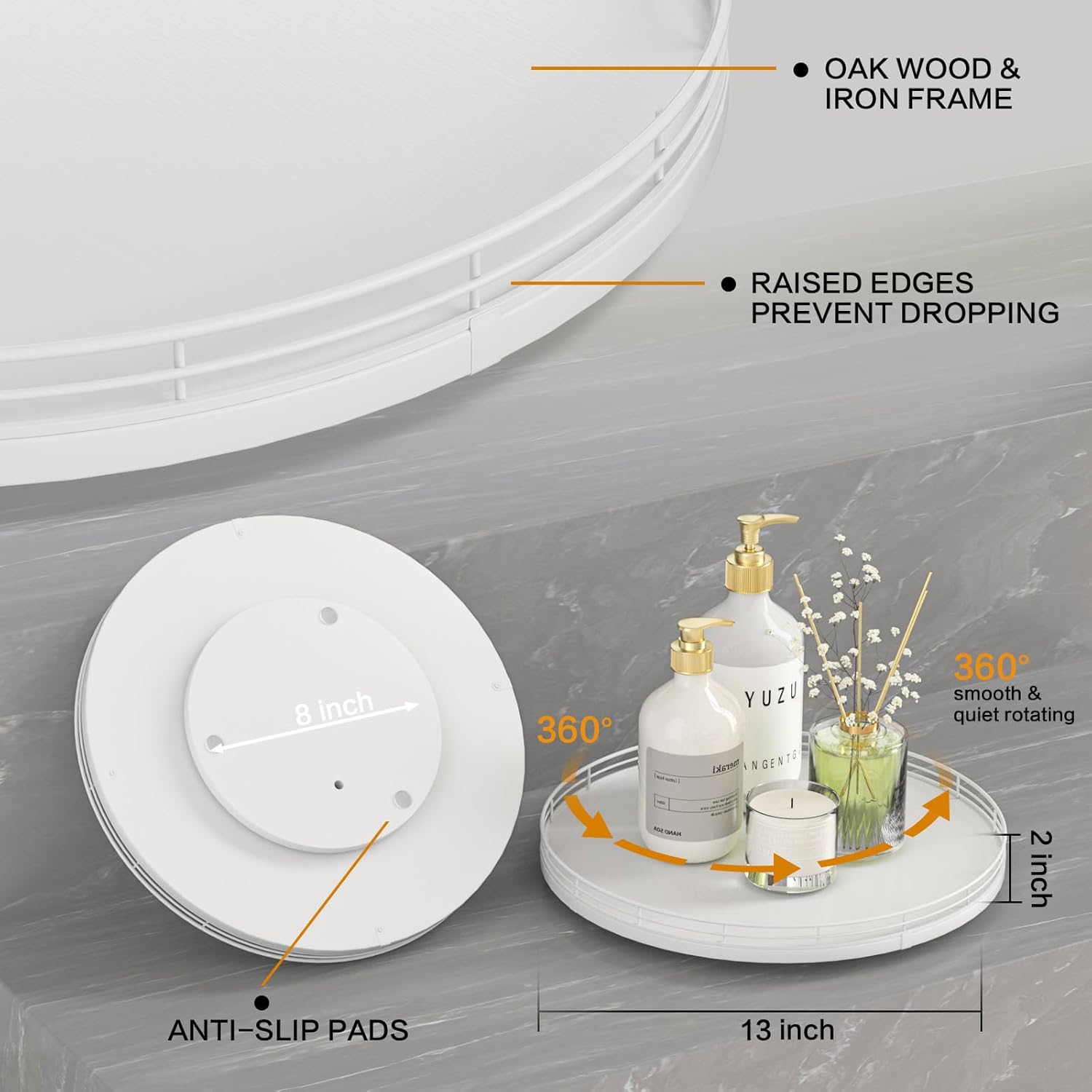 - ๐ง๐ต๐ผ๐๐ด๐ต๐๐ณ๐๐น ๐๐ฒ๐๐ถ๐ด๐ป: The turntable tray features a smooth and silent 360ยฐrotation; Bottom slip-resistant pads for stability and protect your countertop from scratches; Raised edges on each organizer tray to keep items from falling out; Easy to use, no installation required