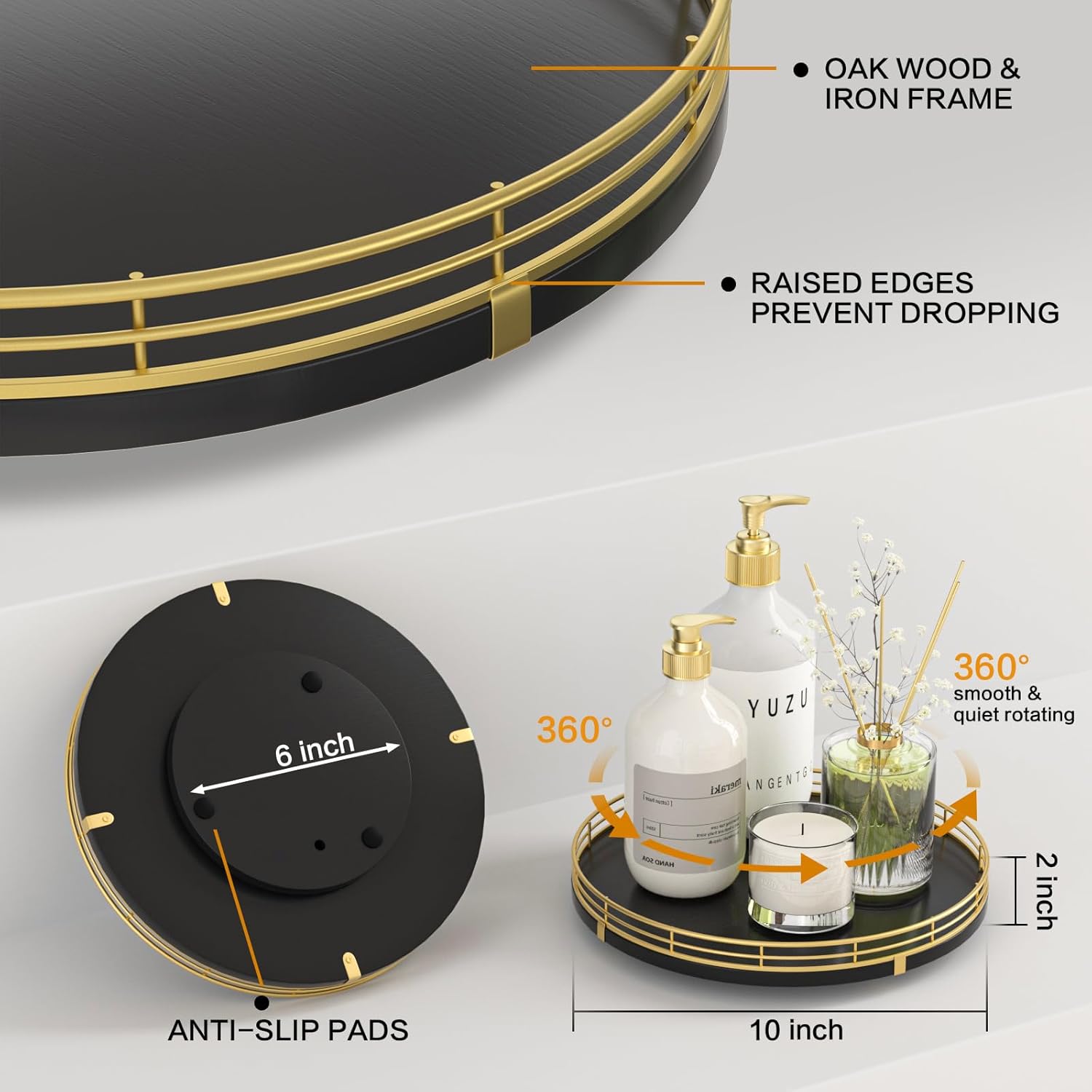 - ๐ง๐ต๐ผ๐๐ด๐ต๐๐ณ๐๐น ๐๐ฒ๐๐ถ๐ด๐ป: The turntable tray features a smooth and silent 360ยฐrotation; Bottom slip-resistant pads for stability and protect your countertop from scratches; Raised edges on each organizer tray to keep items from falling out; Easy to use, no installation required