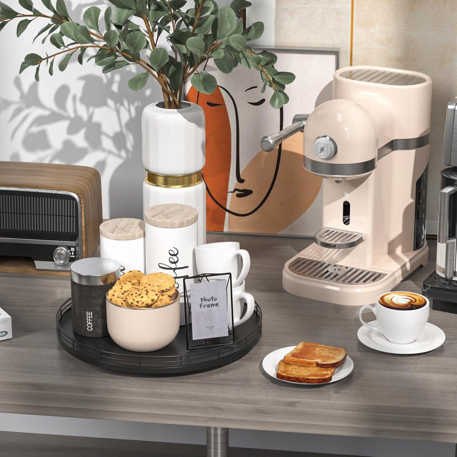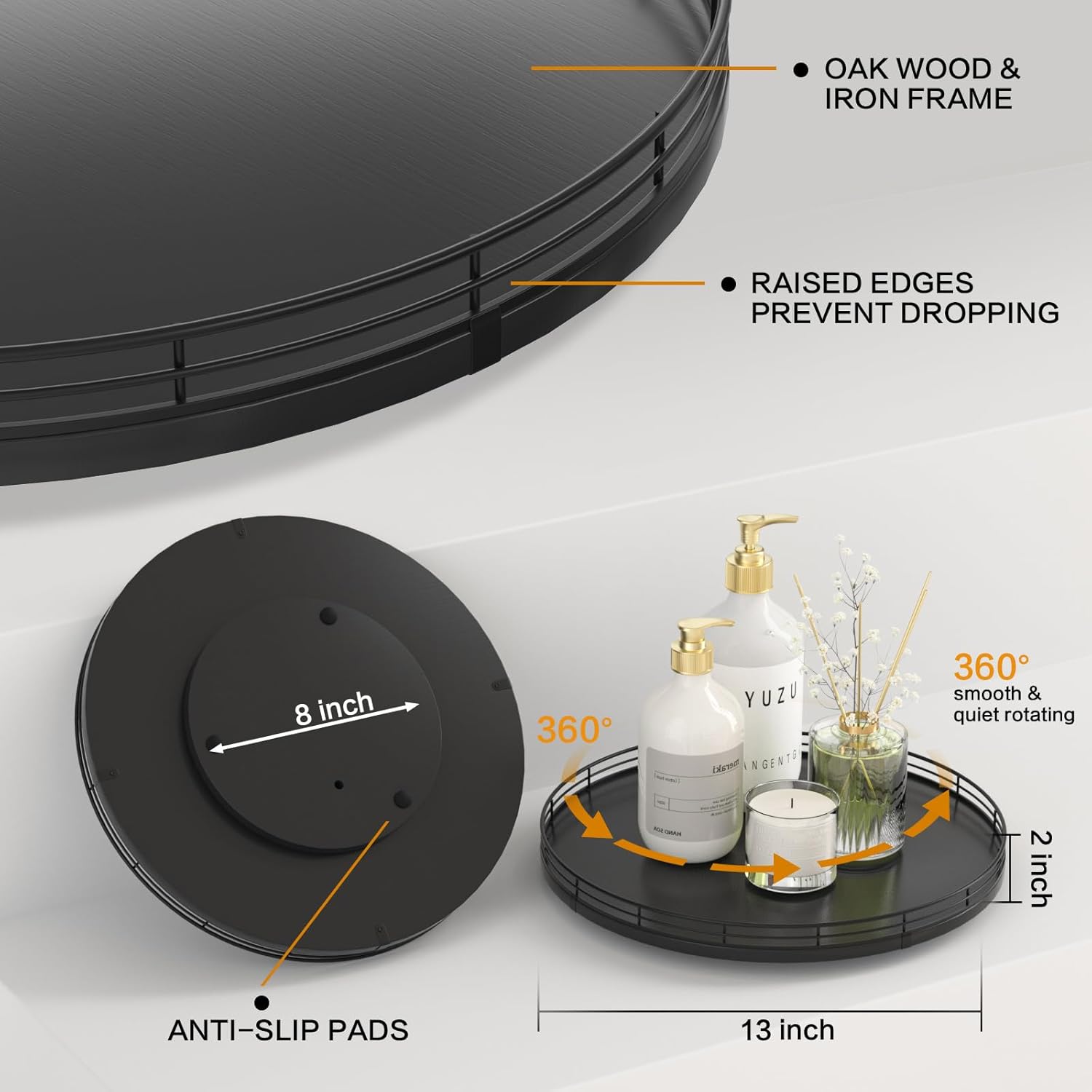 - ๐ง๐ต๐ผ๐๐ด๐ต๐๐ณ๐๐น ๐๐ฒ๐๐ถ๐ด๐ป: The turntable tray features a smooth and silent 360ยฐrotation; Bottom slip-resistant pads for stability and protect your countertop from scratches; Raised edges on each organizer tray to keep items from falling out; Easy to use, no installation required