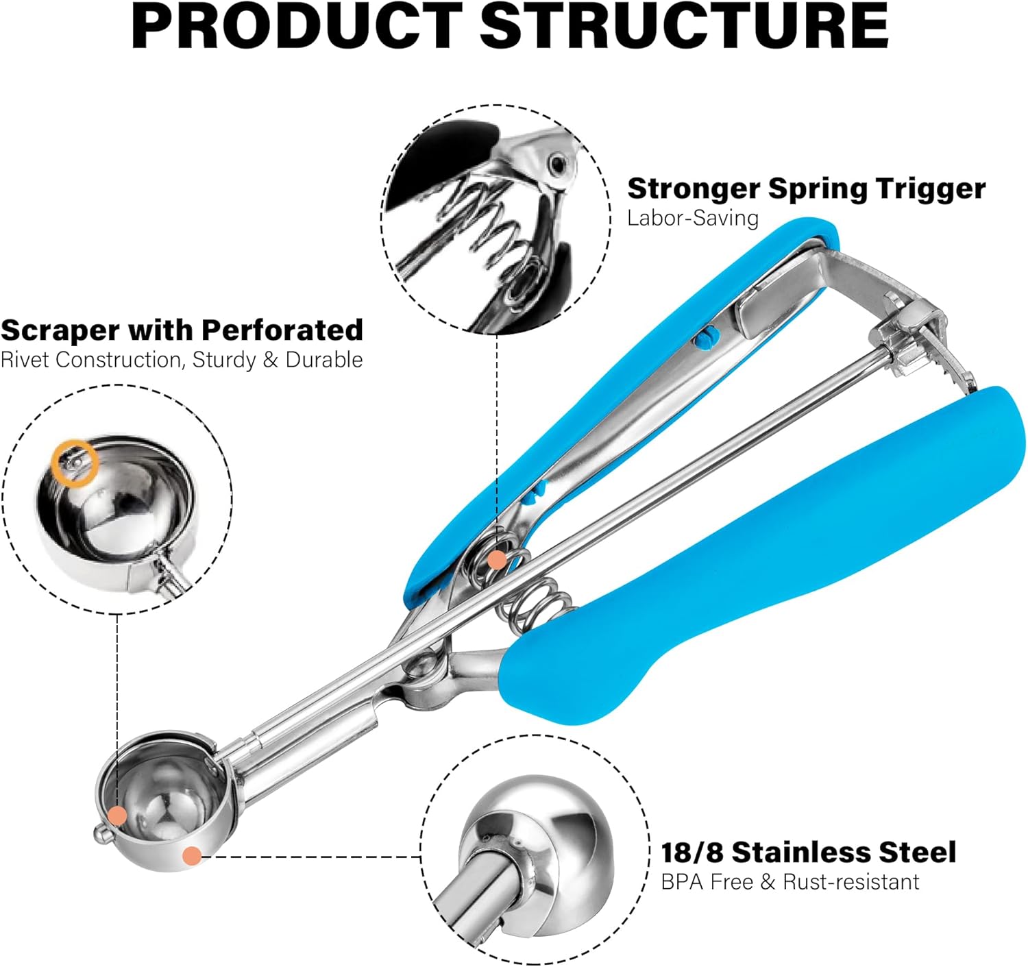- 🍨【Looking for New Kitchen Gadgets?】 Here's a effortless scoop you won't want to miss! Featuring an innovative gear ratchet release system, the ice cream scoop with Trigger Release is perfect for taking the pressure off your wrist and hand when in use, it makes scooping food a breeze! The handle fits your hands comfortably, just squeeze the handle gently and the scoop scraper bar can quickly releases the food neatly.