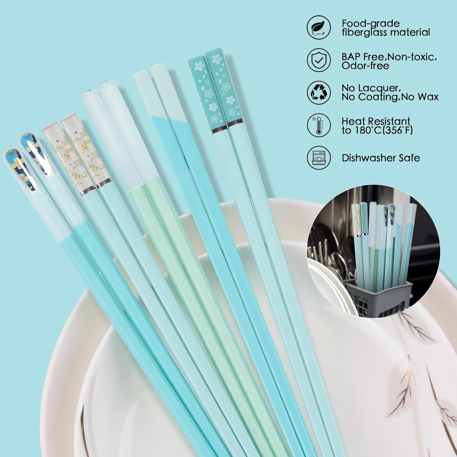Chopsticks Reusable Dishwasher Safe, GLAMFIELDS 5 Pairs 9.5 Inches Premium Chop Sticks Set for Sushi, Ramen, Asian Cuisine, Matte Non-slip with Gift Case, Light Blue