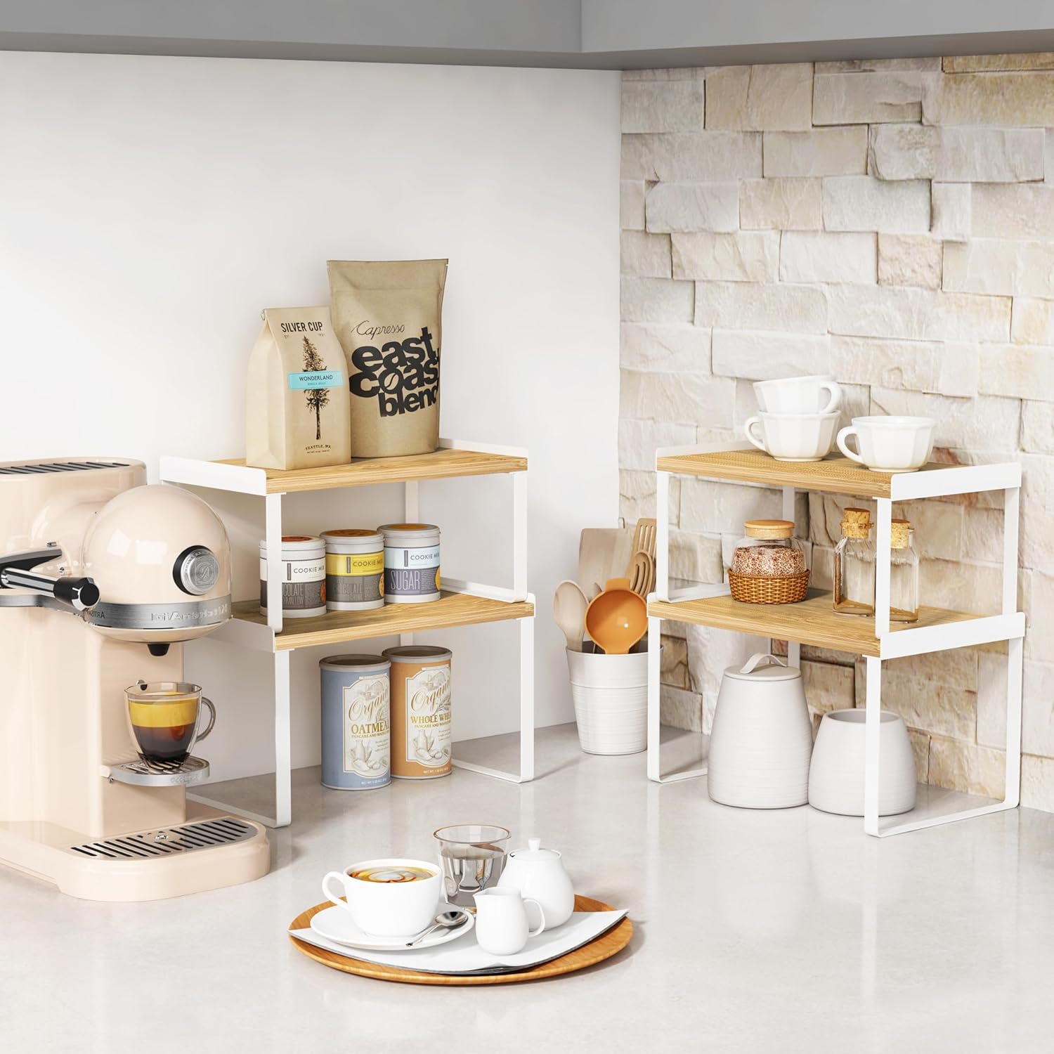 - 【Versatile Shelf Riser Organizer】This cabinet shelf organizers are useful kitchen organization and storage tools to organizer messy items in your cabinet, pantry, cupboard, kitchen counter corner, coffee bar, etc. The shelf organizer can also be used outside the kitchen, as table shelf for your home office and so on.